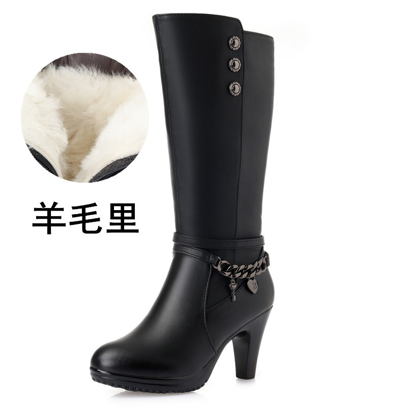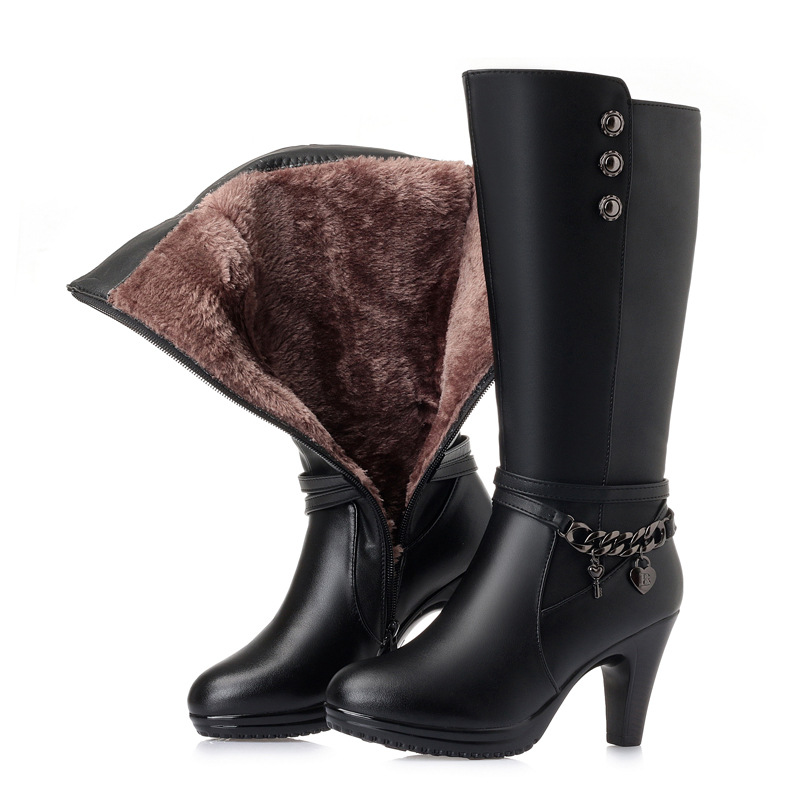 겨울 여성용 가죽 부츠 하이힐 마틴 부츠 얇은 힐 울 면 부츠 기모 두꺼운 플러스 사이즈 중년 엄마 부츠