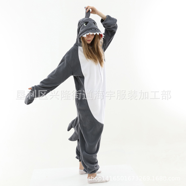 새로운 커플 긴 소매 만화 원피스 잠옷 회색 상어 양털 홈 커플 공연 의류 후드