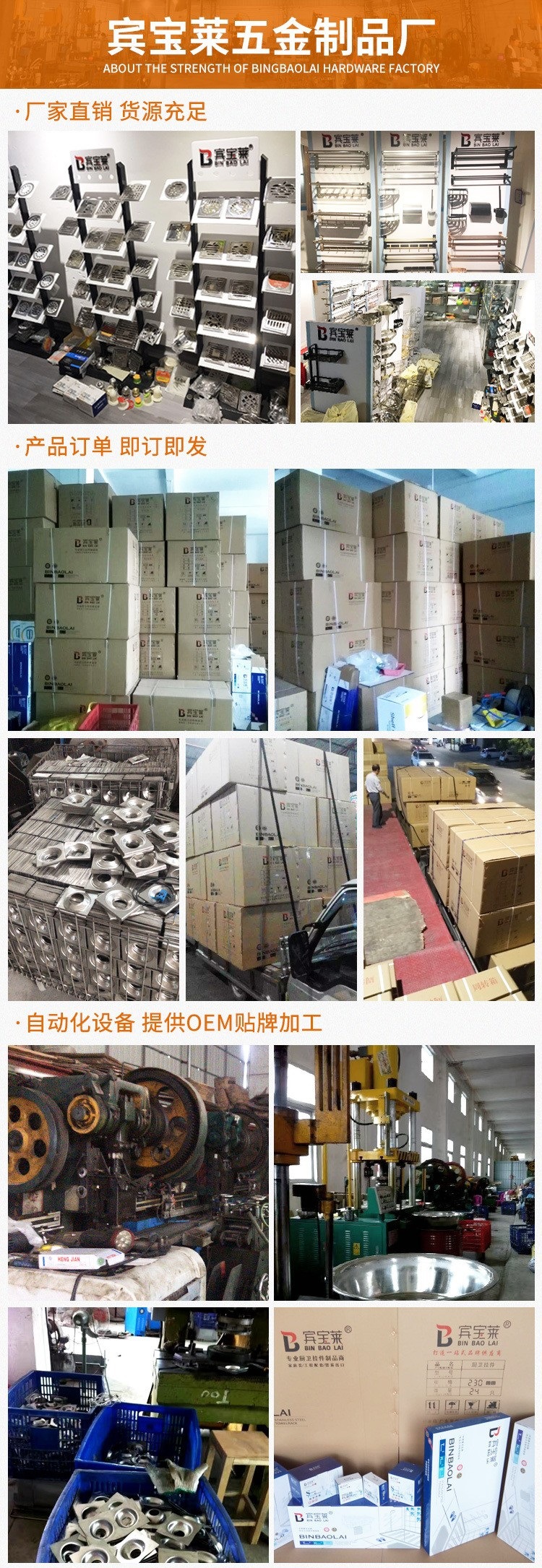 广东省潮州市彩塘宾宝莱五金制品厂是一家集研发、设计、制造、销售为一体的经营机构。专业生产销售各类浴室厨房配套系列产品,产品主要包括:各式地漏系列,201/304不锈钢浴巾架,太空铝毛巾架,层架,置物架,刀架,衣钩,纸巾盒等一系列产品。厂址位于拥有“不锈钢制品之乡”美称的广东省·彩塘镇,享着先天独厚的优势,先进的生产设备和团队技术力量,成就多年来一直都有实力雄厚的品牌商达成战略合作伙伴。本厂产品品种多样,款式齐全,工艺精湛,在厨卫界享有美誉。