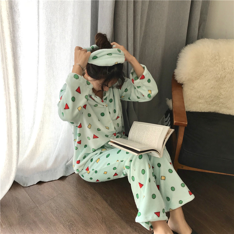 폭발 크레용 작은 새 잠옷 여성의 겨울 패딩 플란넬 기하학적 세트 산호 양털 아이 마스크 해외 무역 도매