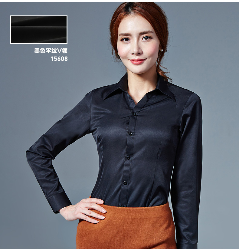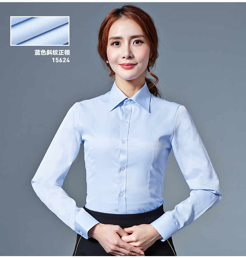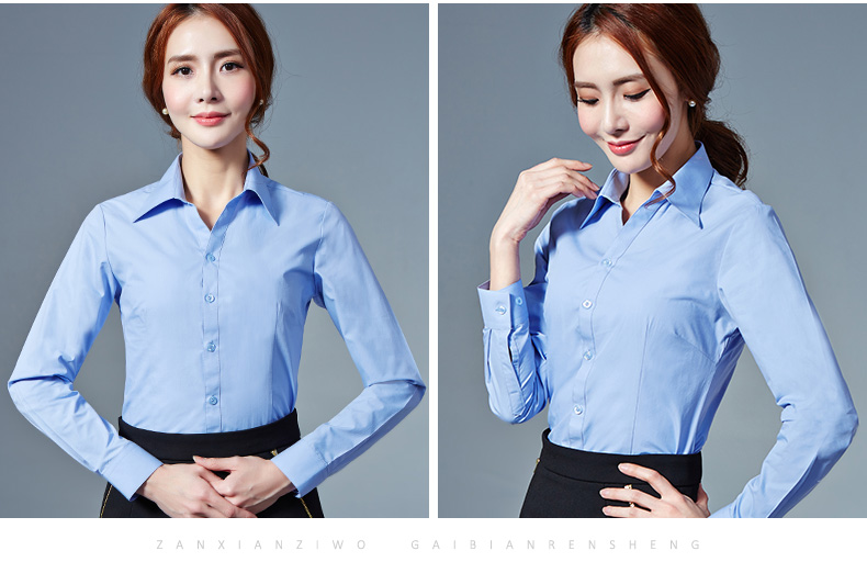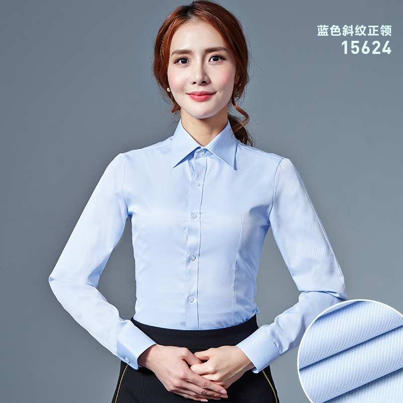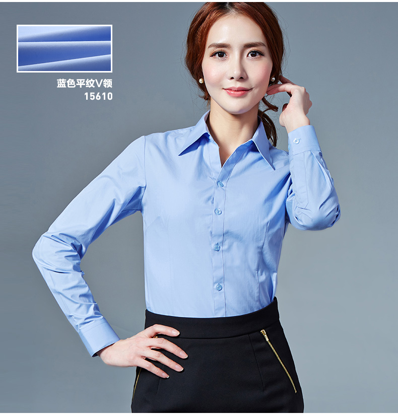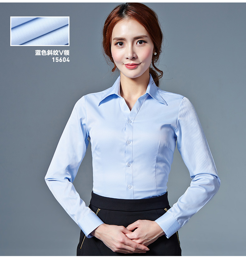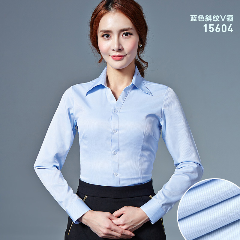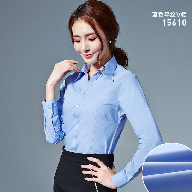 가을 긴 소매 셔츠 여성의 전문 작업 원피스 슬림 V-넥 OL 통근 순수 블루 셔츠 여성 기본 셔츠 작업복스토어 가기