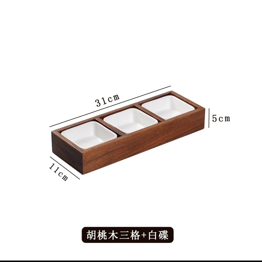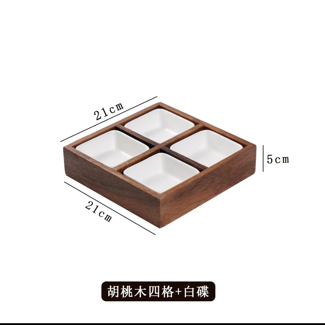 • 호두나무 4구 상자 + 세라믹 화이트 접시