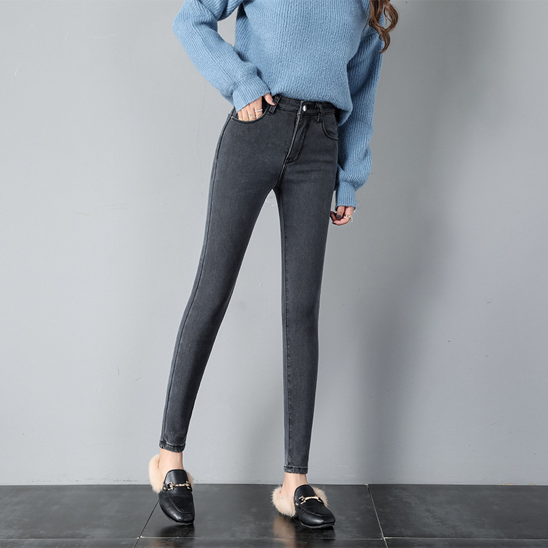 리얼 샷 2023 한국 학생 하이 웨이스트 청바지 여성 바지 플러스 사이즈 탄성 타이트 슬림 연필 바지스토어 가기