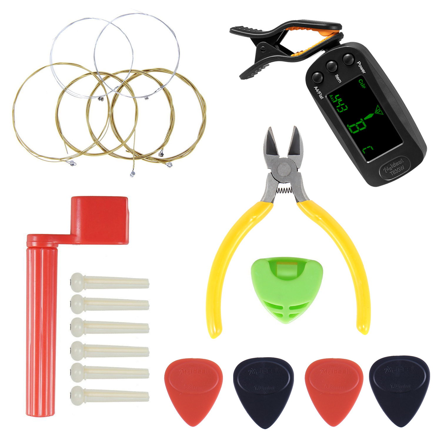 包裹内容:6*琴弦;1*卷弦器(随机色);6*弦钉(ABS);1*拨片夹(随机色);1*T83GW;4*拨片(随机颜色/尺寸);1*剪弦钳(黄色);