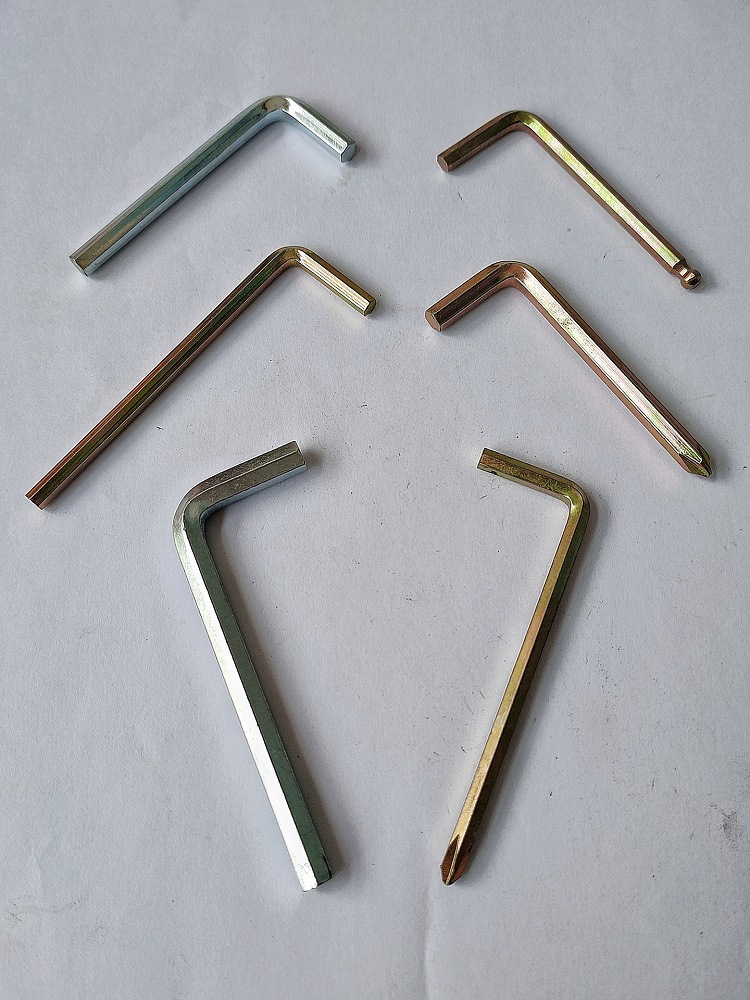 东莞市大岭山凯恒五金生产各种家具五金螺丝用内六角扳手。有十字内六角L型扳手,球头内六角L型扳手,Z型内六角扳手和圆柱L型防盗扳手及三角圆棒十字扳手。规格有M3,M4,M5,M6,M8.可来图来样订制。欢迎旺旺交流或者拨打厂长在线。