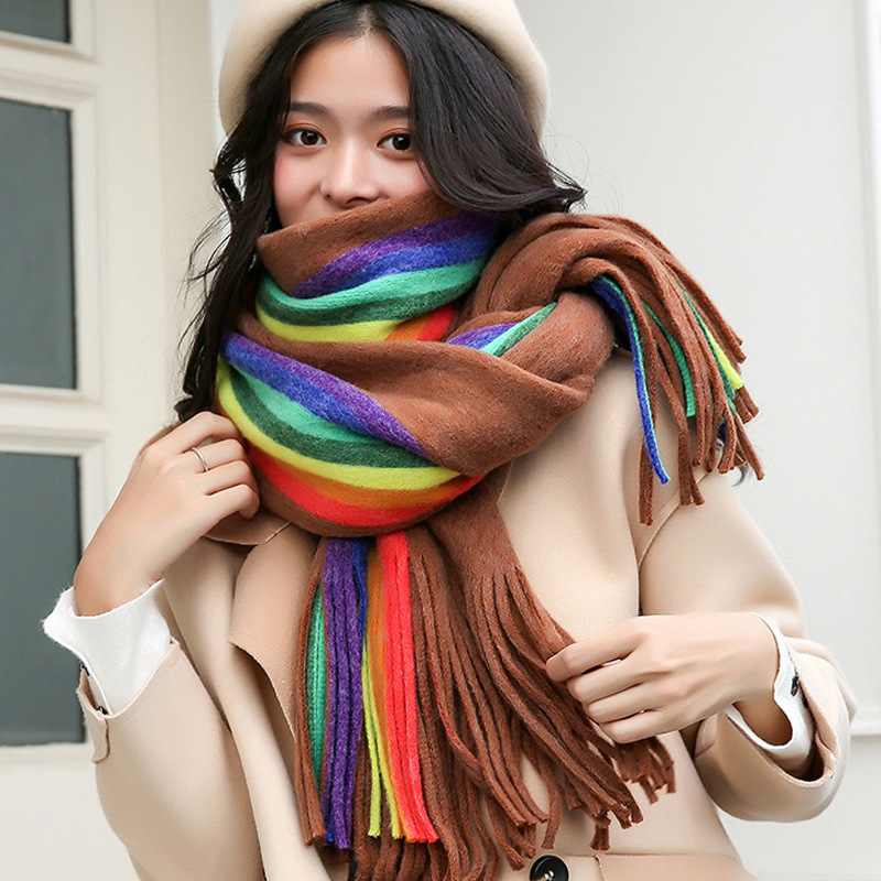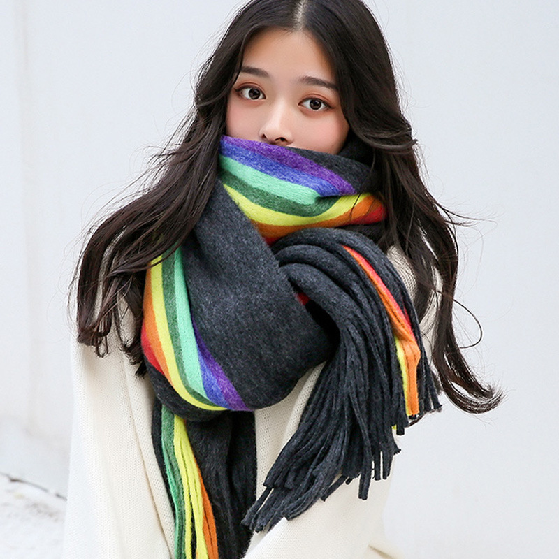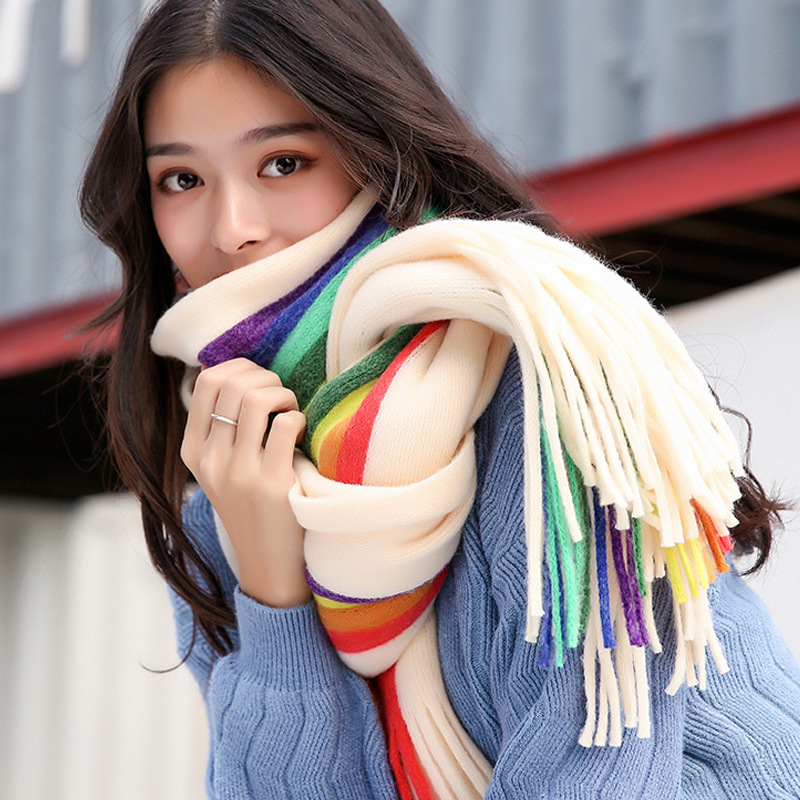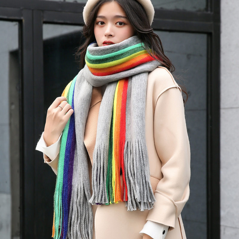 레인보우 스카프 여성용 가을과 겨울 한국 스타일 모든 경기 학생 숄 소녀의 부드러운 소녀의 겨울 두꺼운 따뜻한 목 이중 사용