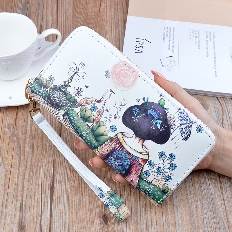 새로운 여성 지갑 여성용 긴 지퍼 클러치 소프트 지갑 한국어 인쇄 패션 학생 변경 휴대 전화 가방