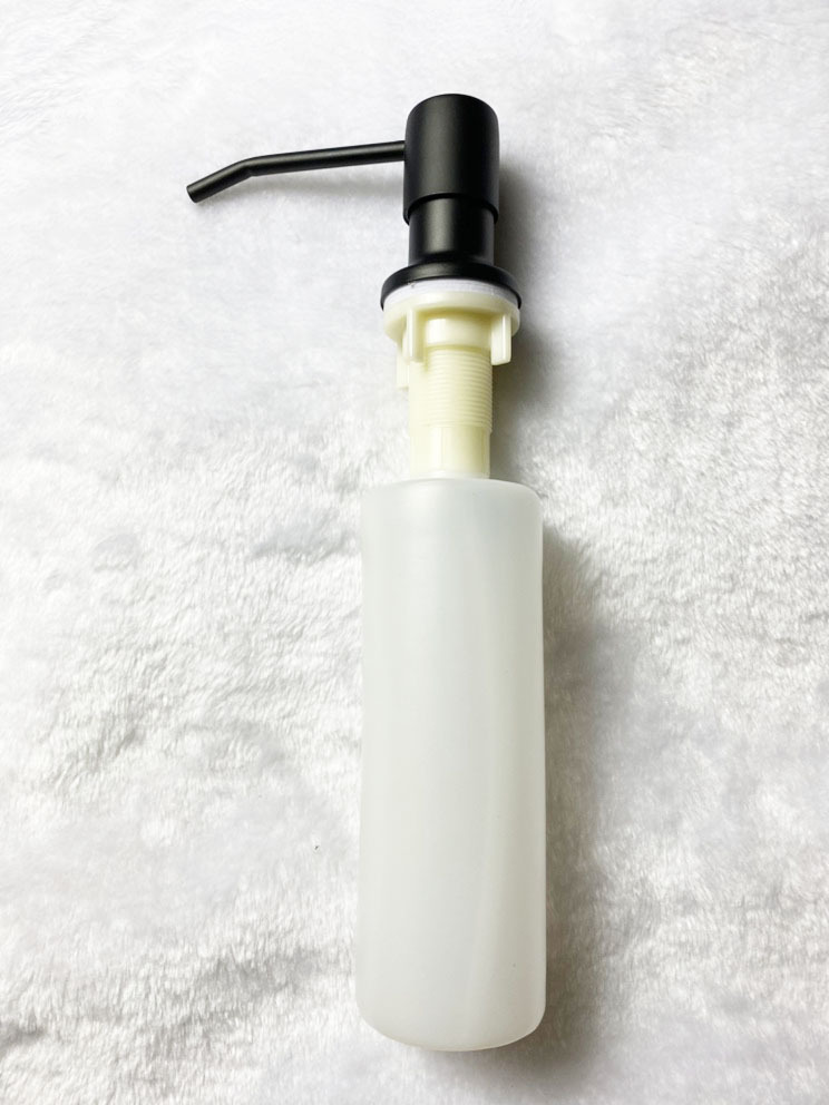 皂液器为304不锈钢按压头(烤漆表面)+ PP材料瓶身(容量300毫升),以及全新ABS材料制作,水槽开孔25mm-36mm的都可以通用 。