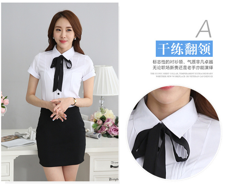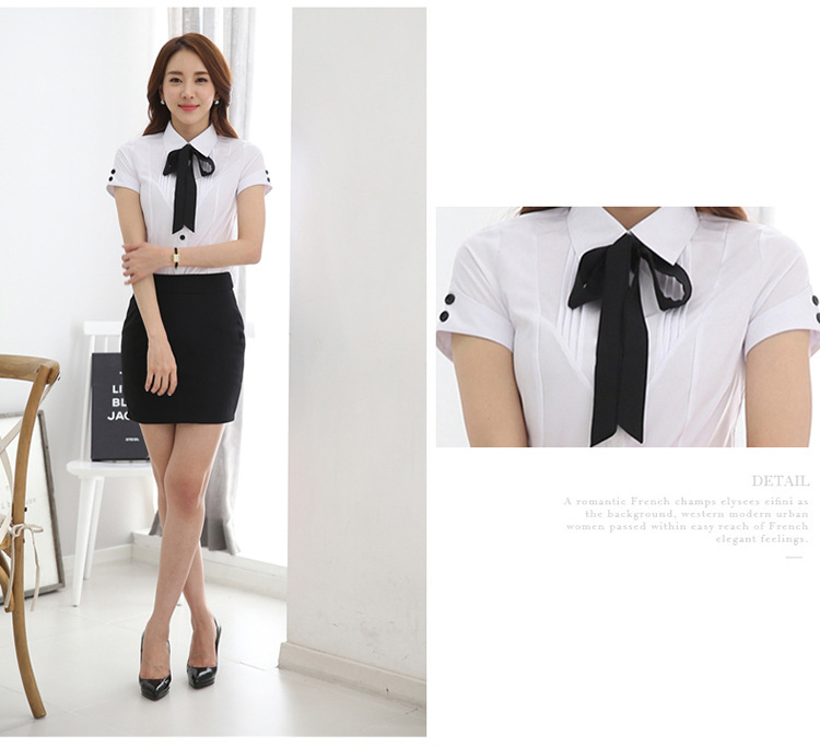 여름 새로운 한국 스타일 반팔 블라우스 비즈니스웨어 슬림핏 아카데미 스타일 보우 화이트 쉬폰 셔츠