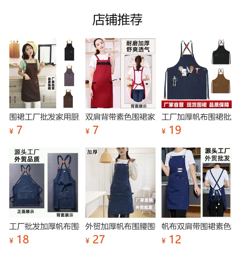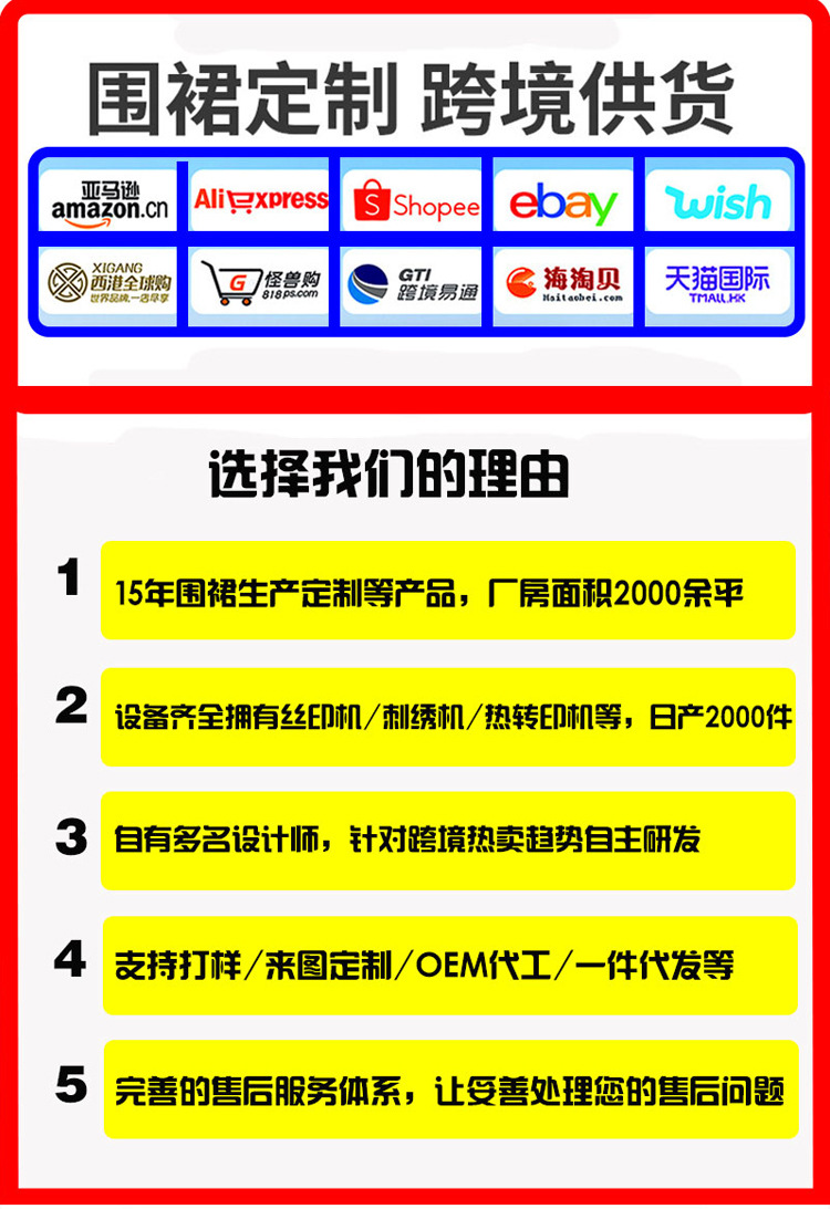 本厂是专业生产围裙20年的工厂,有着丰富的生产,定制经验,日产量8000+ 全套的生产设备,定制印字刺绣一站式服务 。 来样定制,代加工,一件代发,满足多样需求 跨境电商专属:opp包装,装箱,贴标等服务。 让您售后无忧,快速响应,贴心服务一路相伴。