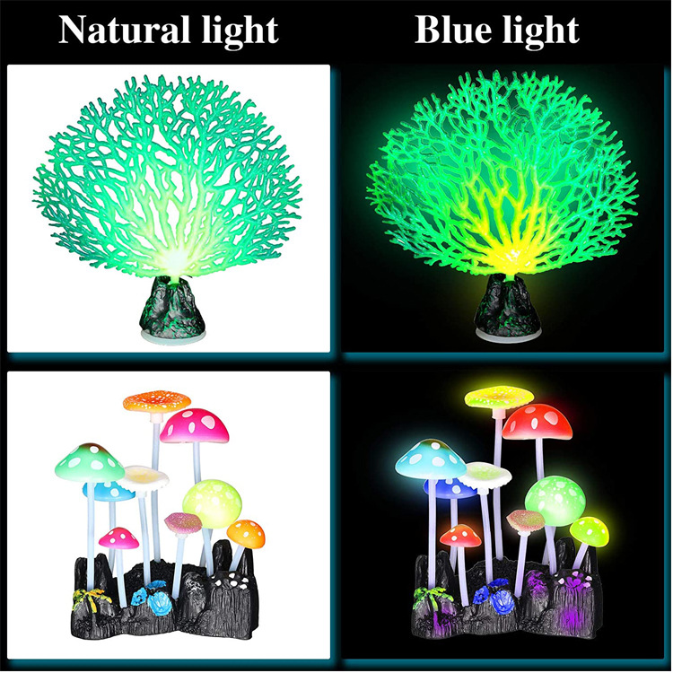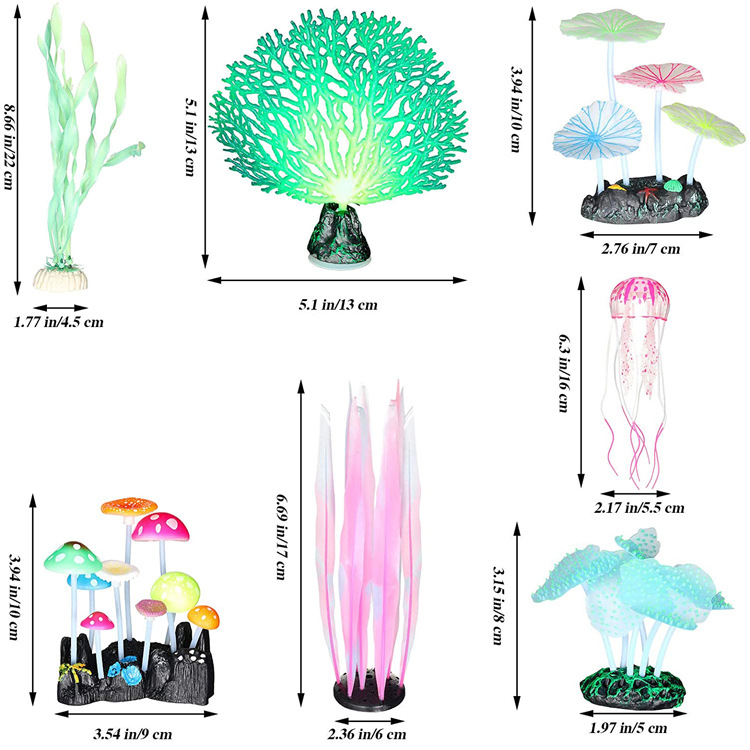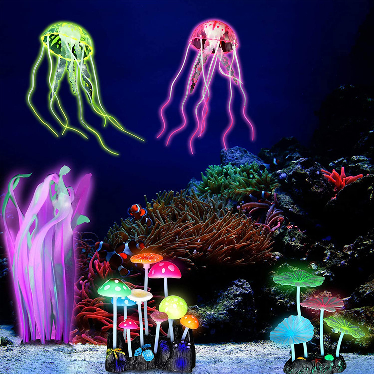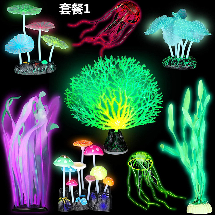 8 件发光鱼缸装饰植物,含 2 种风格的发光海藻、海莲花、仿真珊瑚、水母、莲叶、蘑菇,适合水族箱鱼缸发光