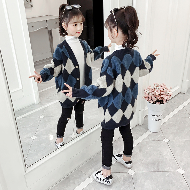 여아 가디건 스웨터 새로운 겨울 봄과 가을 긴 두꺼운 다이아몬드 격자 무늬 스웨터 코트 최신 유행 소녀스토어 가기
