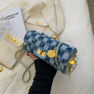 个性牛仔布乞丐包包女2022新款链条单肩女包格子斜挎包毛边圆筒包