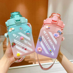 大容量食品级塑料渐变色水杯便携吸管卡通透明杯子大手柄弹盖水壶