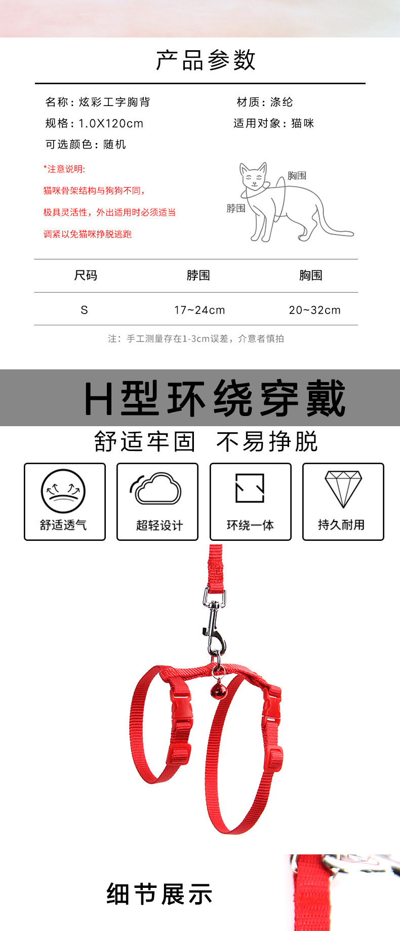 애완 동물 고양이 체인 고양이 고리 견인 로프 고양이 벨 칼라 조정 가능한 애완 동물 가슴 스트랩 고양이 로프 도매스토어 가기