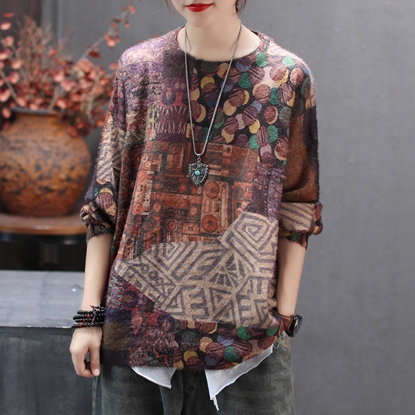 가을과 겨울 루즈한 탑 긴팔 라운드 넥 니트 셔츠 캐주얼 풀오버 에스닉 스타일 여성용 프린트 스웨터