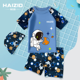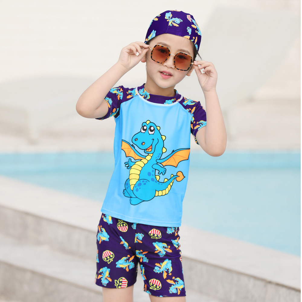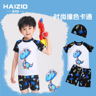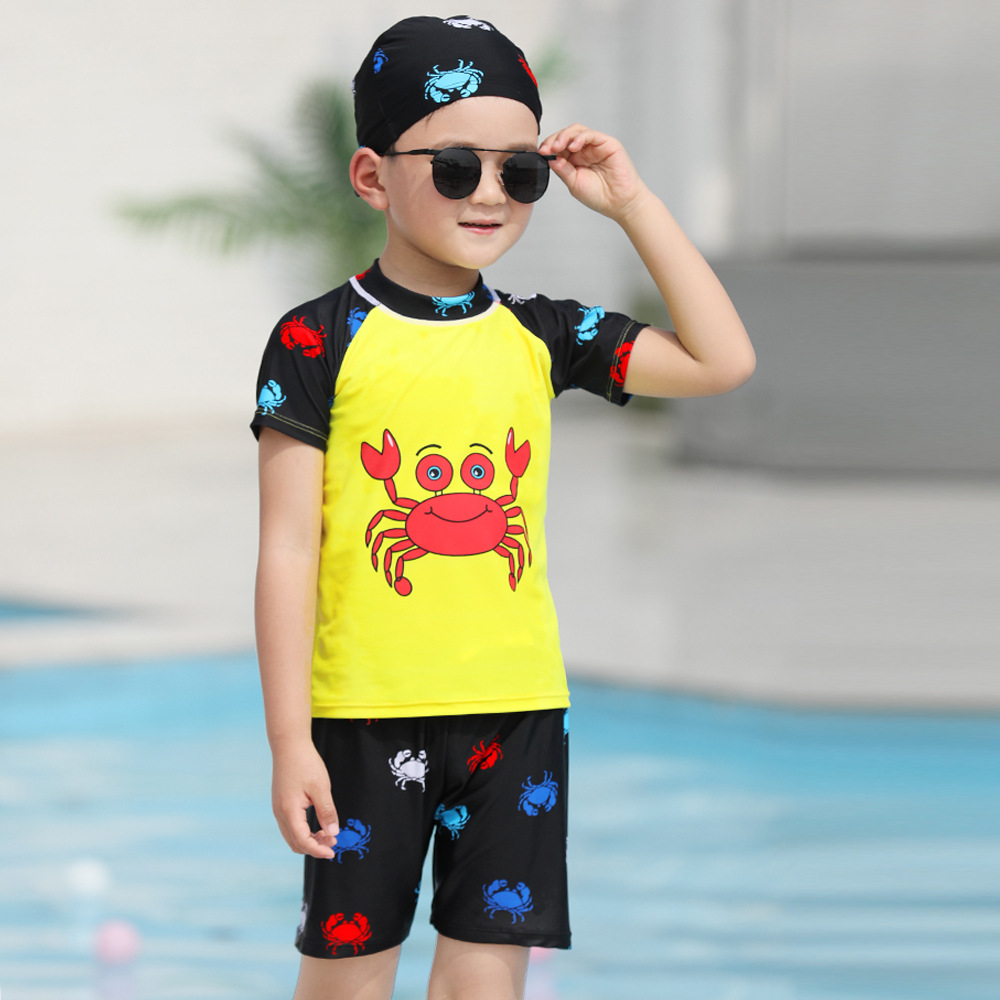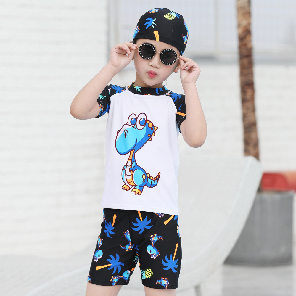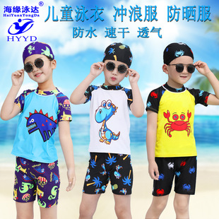 儿童泳衣男童游泳衣中大童温泉泳帽泳裤套装批发短袖宝宝卡通泳装