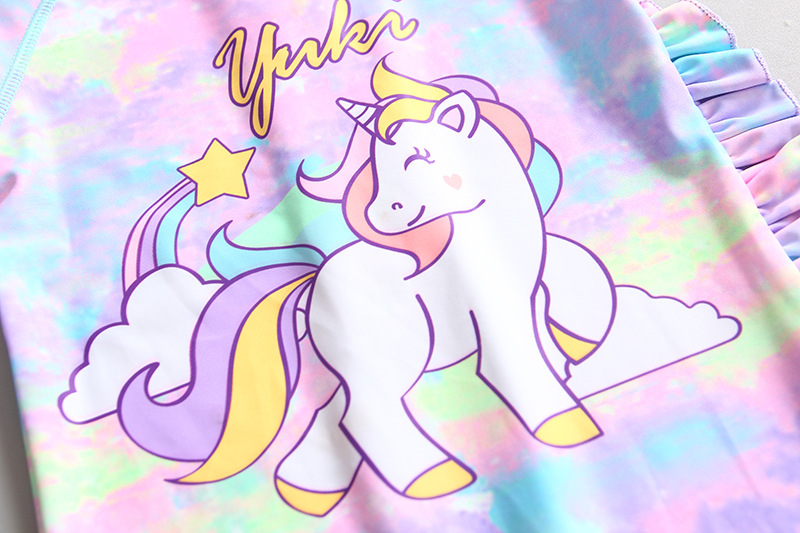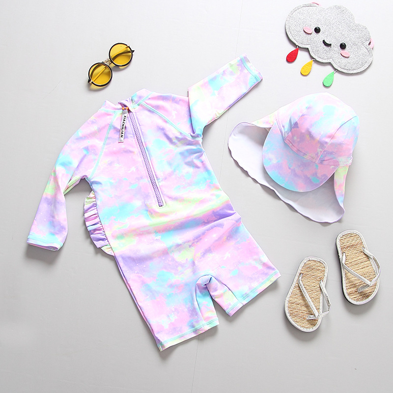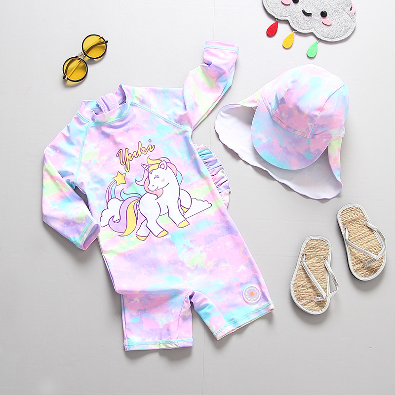한국 INS 스타일 어린이 수영복 소녀 아기 레인보우 포니 원피스 자외선 차단제 수영복 서핑 옷 세트 트렌디스토어 가기
