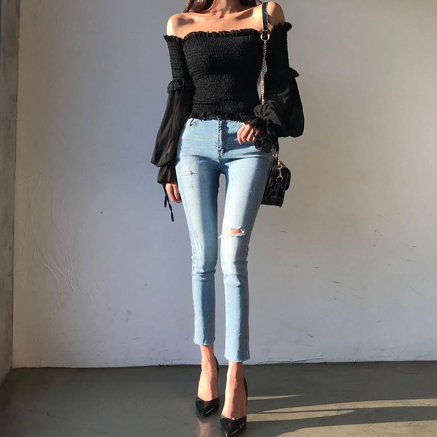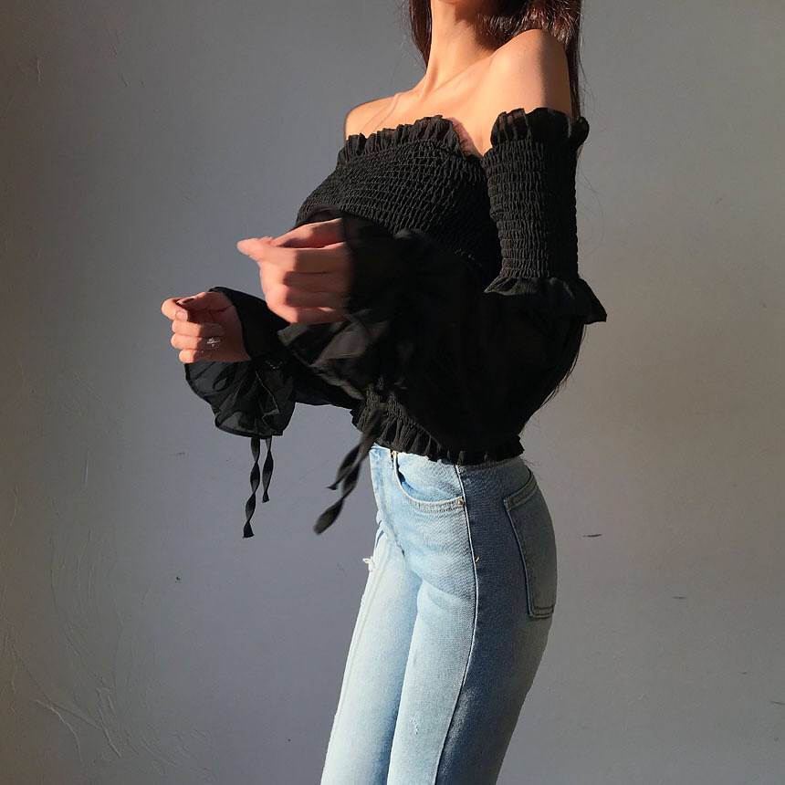 In Hyuna 같은 스타일 프랑스 코트 탑 우아한 랜턴 슬리브 새는 쇄골 오프 숄더 섹시한 흰색 셔츠스토어 가기