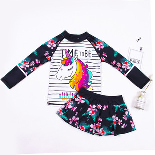 儿童泳衣 女童长袖分体裙摆独角兽中大童游泳衣 女孩沙滩泳装批发