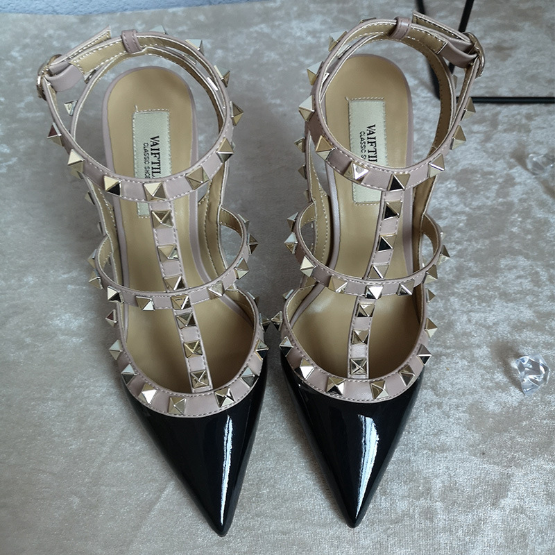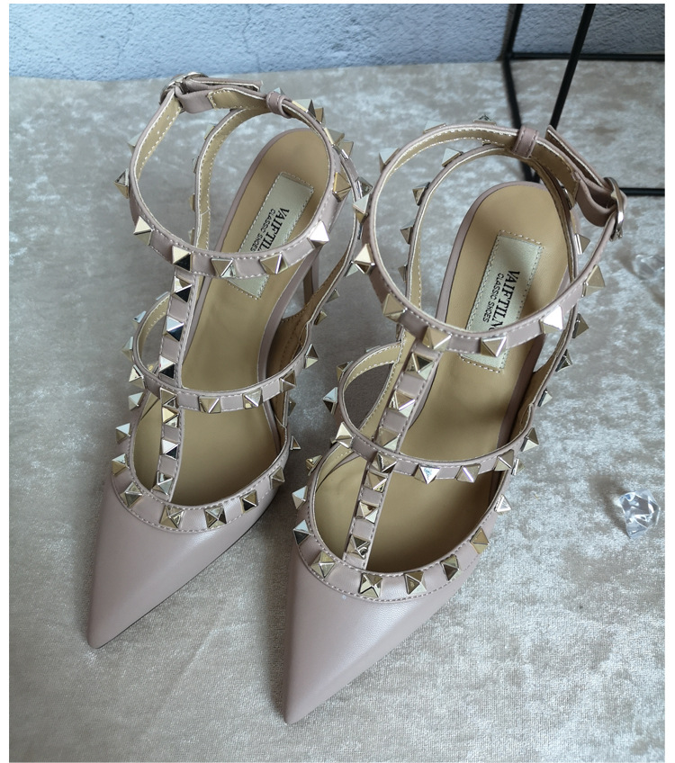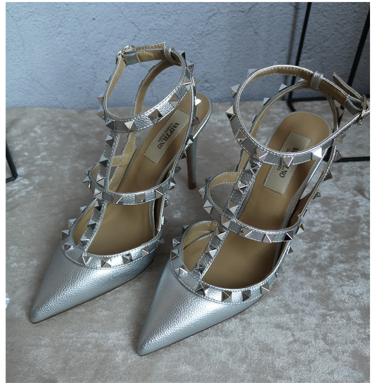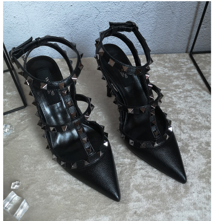 2025 스타들과 같은 스타일의 V 브랜드 리벳 장식 뾰족코 하이힐, 초하이힐, 스틸레토 힐, 스트랩 샌들, 인터넷 연예인 스타들의 신발, 여성용스토어 가기