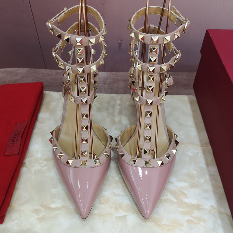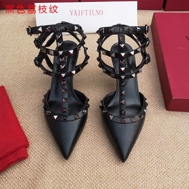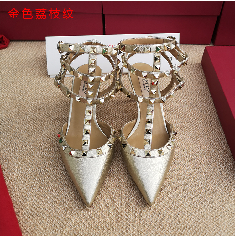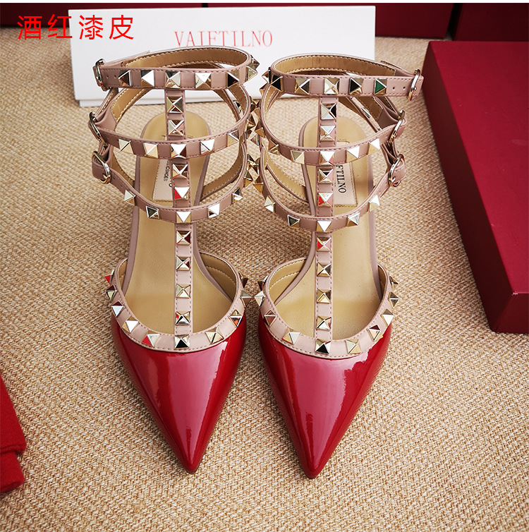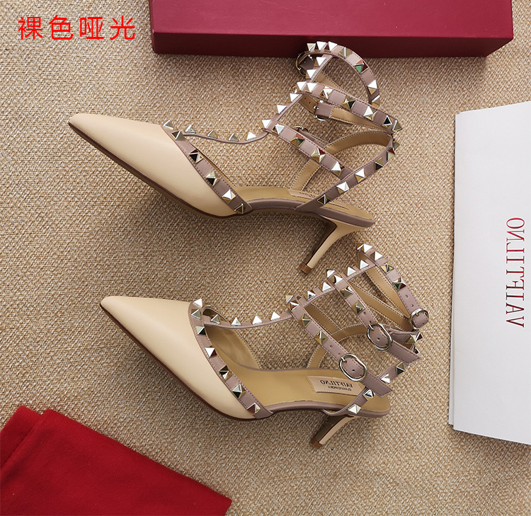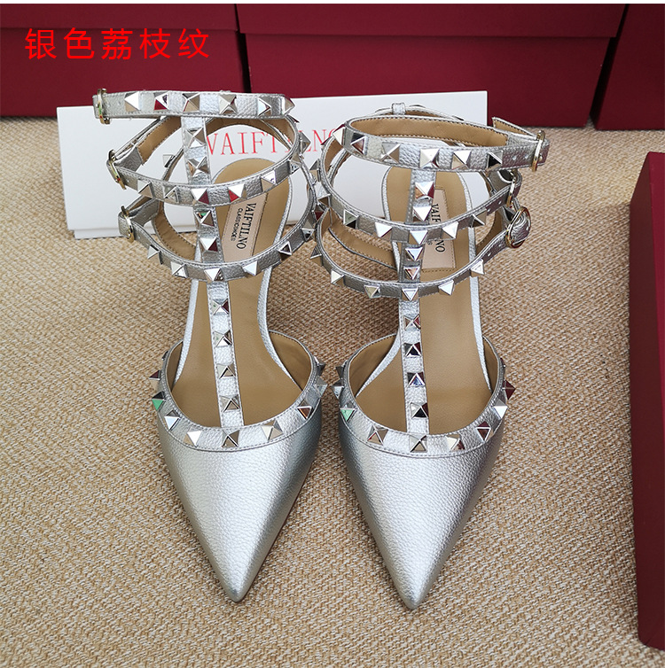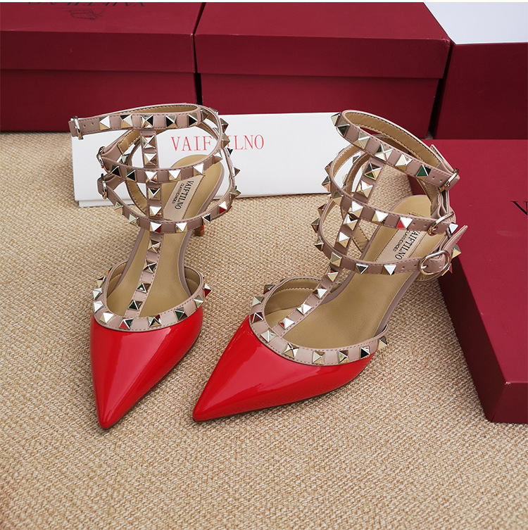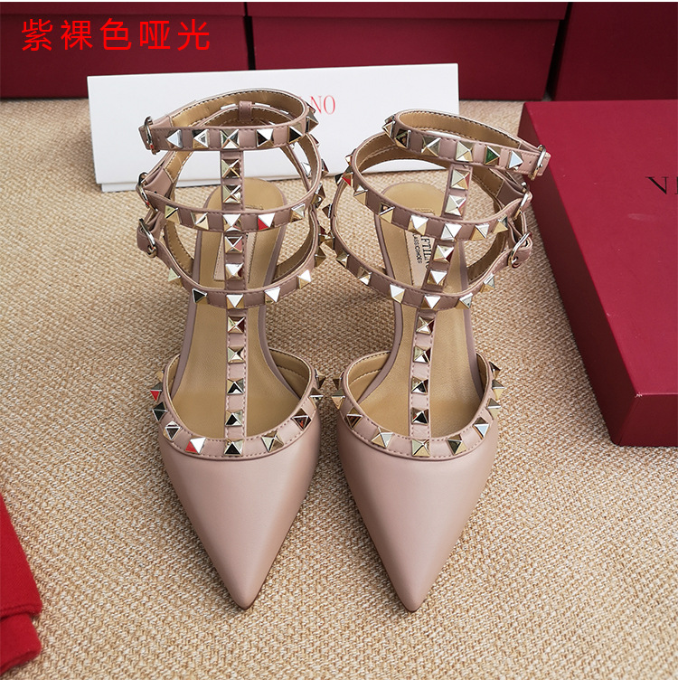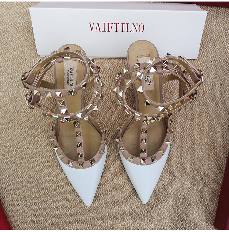 리벳 뾰족한 하이힐 슈즈 여성용 V 홈 스터드 스트랩 컬러 매칭 Baotou 샌들 얇은 굽 중간굽 겉옷 여름 조수스토어 가기
