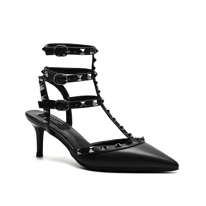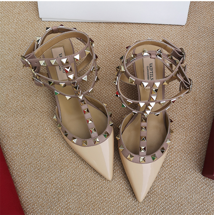 리벳 뾰족한 하이힐 슈즈 여성용 V 홈 스터드 스트랩 컬러 매칭 Baotou 샌들 얇은 굽 중간굽 겉옷 여름 조수