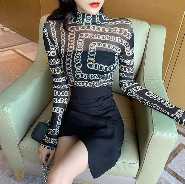 섹시한 올 매치 슬림 핏 빈티지 프린트 긴 소매 스탠드 칼라 티셔츠 메쉬 최고의 여성 트렌디 S1271 체인 메쉬