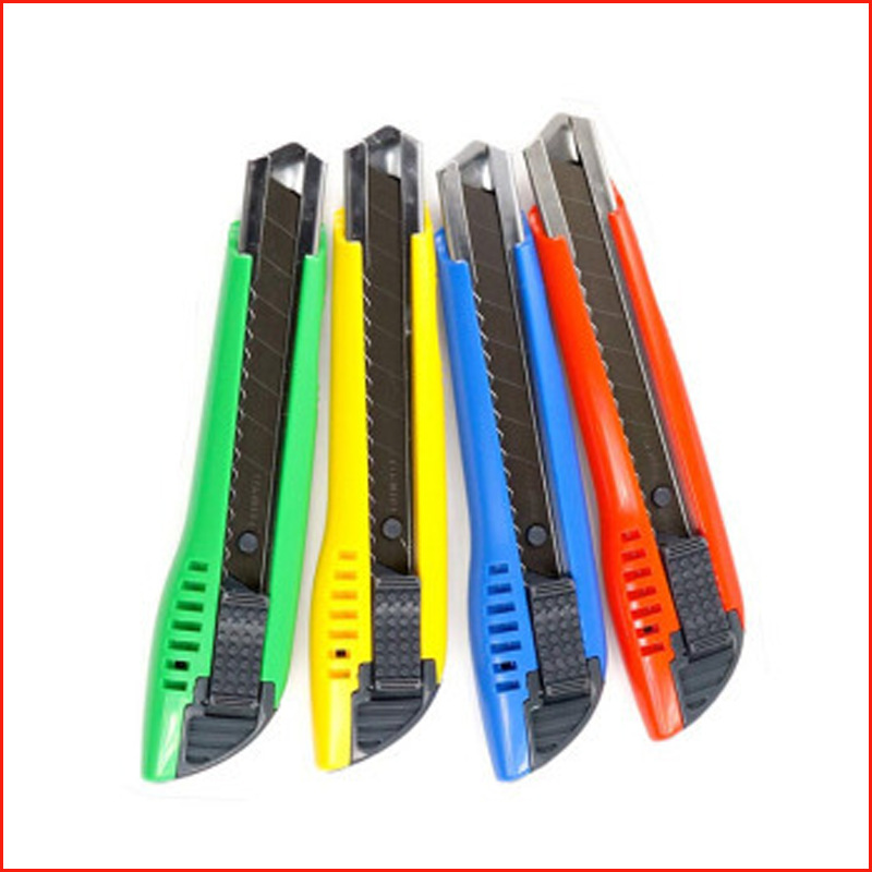 大号美工刀,适配18mm宽刀片,长约16cm,宽约      3.2cm,厚约1.8cm,重约65克/把(含包装),36把/  箱三色装。