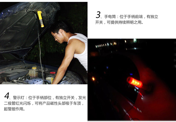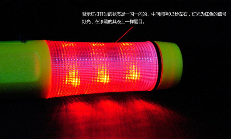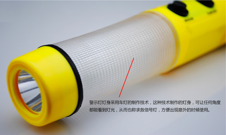 4、警示灯:位于手柄部位,有独立开关,9个发光二极管红光闪烁,可将产品磁性头部吸于车顶,起报警作用。
