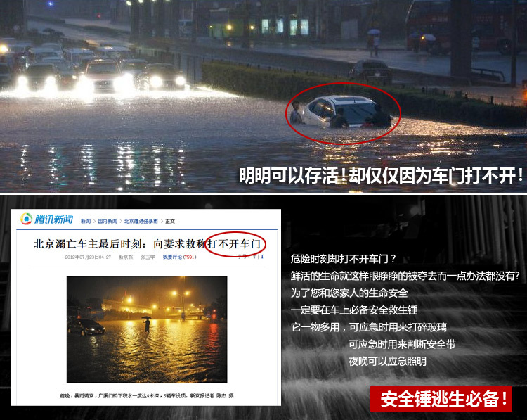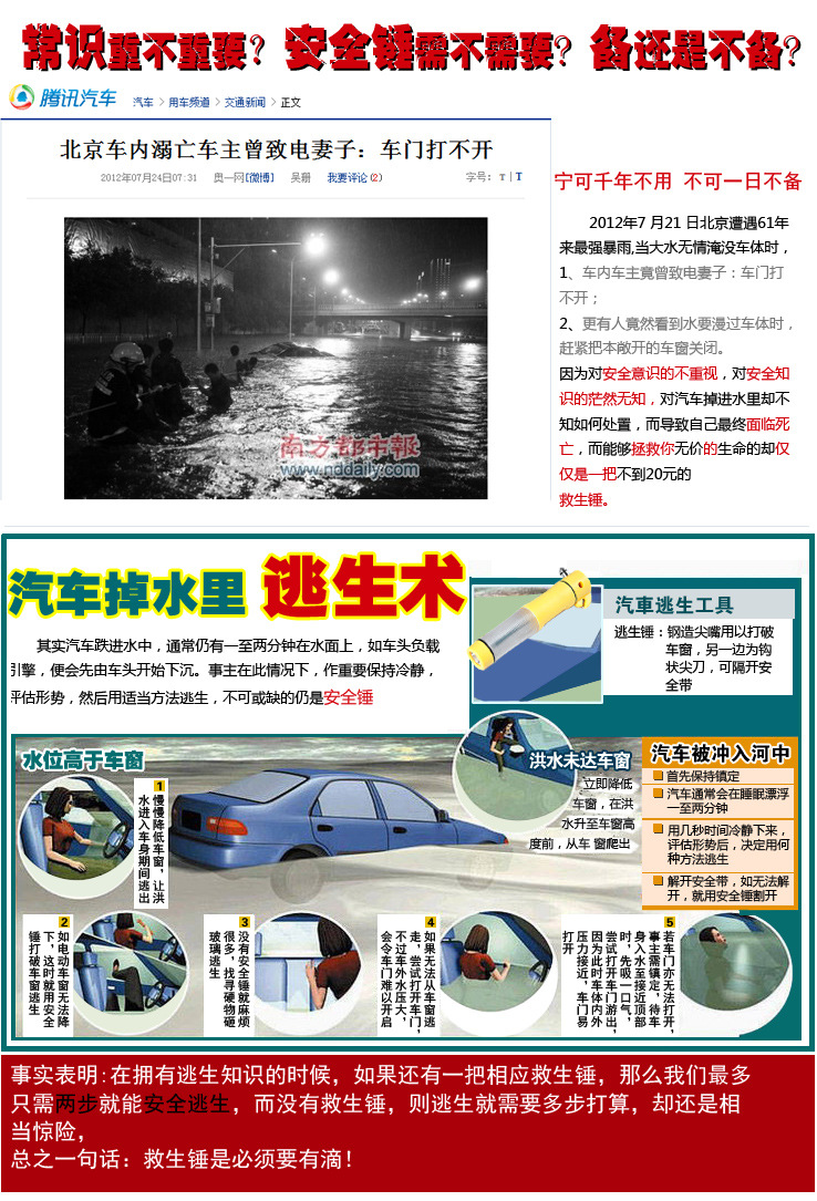 安全锤的正确使用:动车追尾事故发生,当旅客准备逃生时,他们发现用破窗锤砸玻璃无效,即使用尽全力砸车窗玻璃也文斯未动, 后从车厢裂断处逃生。实际上,安全锤砸玻璃中间是砸不开的,要砸玻璃的四个角!!!