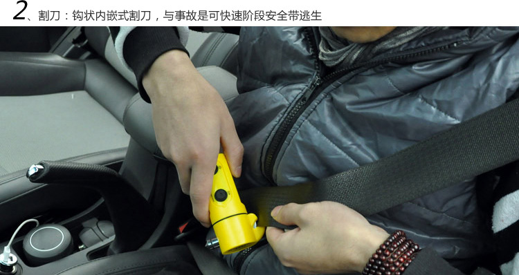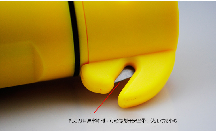 若遇事故,无法解开安全带时用刀口切断安全带逃生。