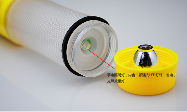 按下手电开关,顶部的荧光灯泡会亮,用以照明。