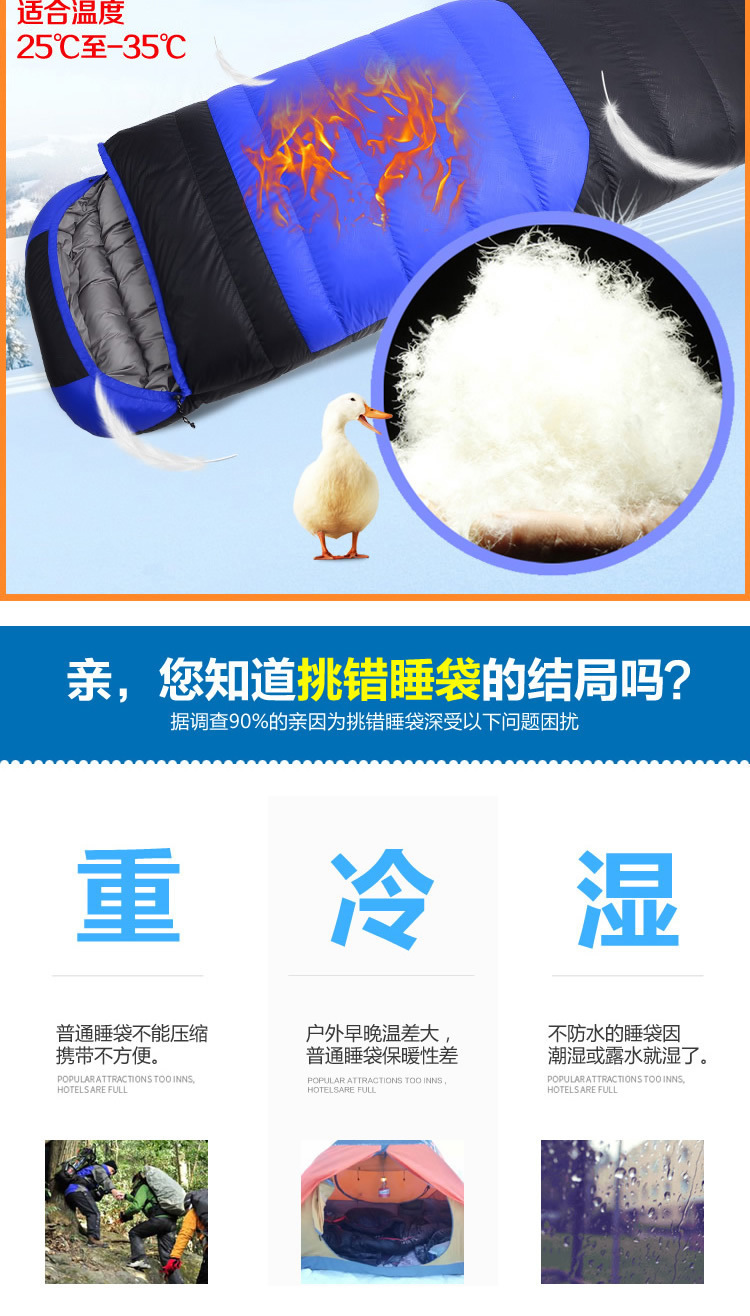 다운 침낭 봉투 기계 빨 방한 특수 두꺼운 따뜻한 여행 침낭 성인 산악 캠핑 여행 침낭