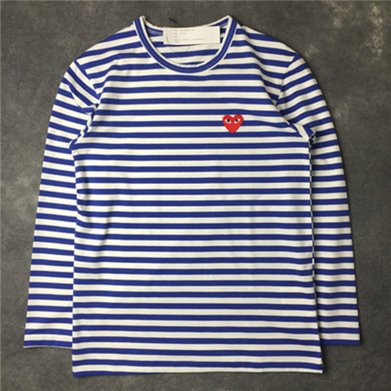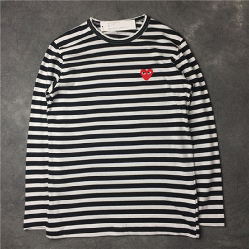 일본식 플레이 패션 브랜드 수 놓은 하트 레드 하트 스트라이프 남성 긴팔 바닥 셔츠 커플의 전체 소매 티셔츠 남성과 여성