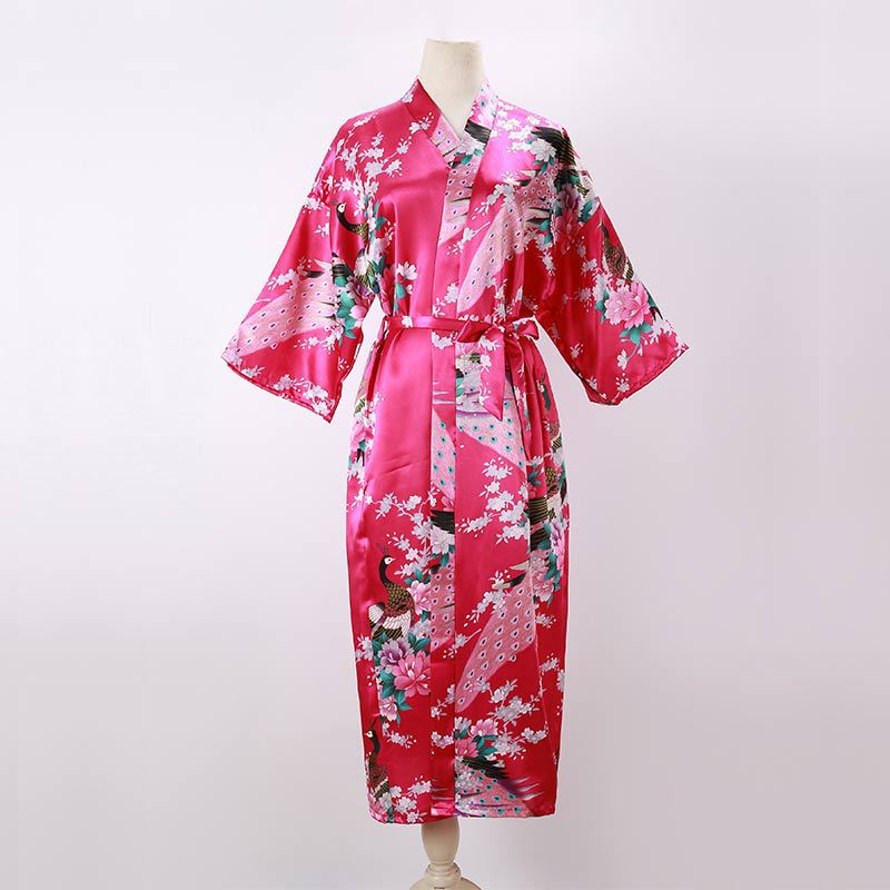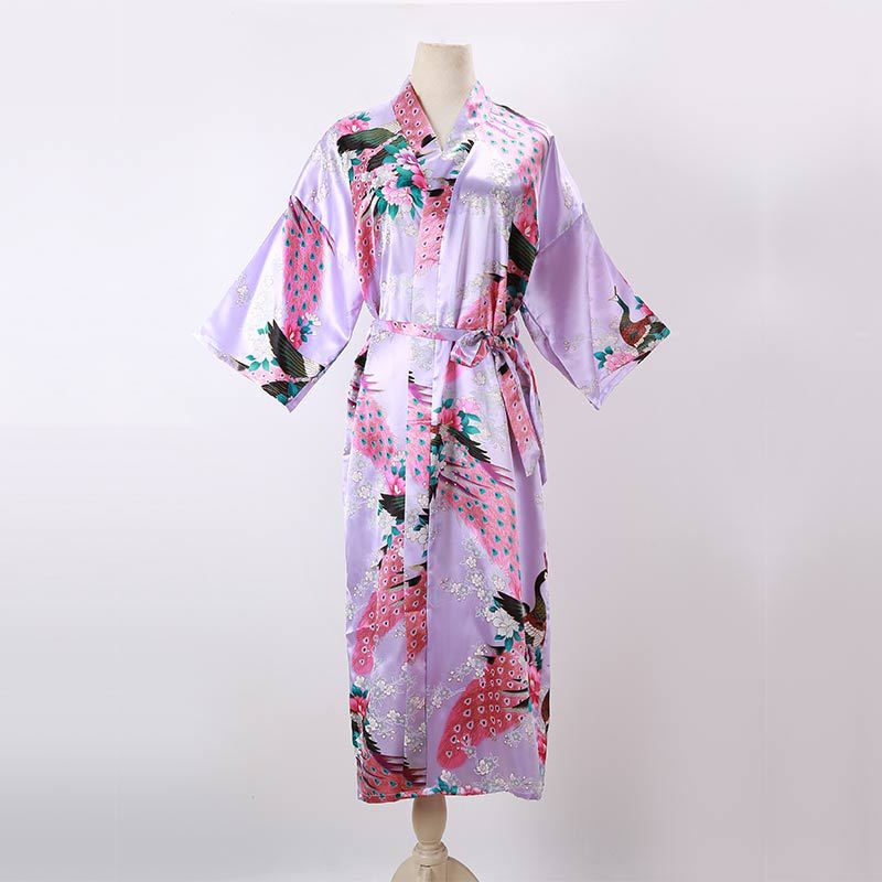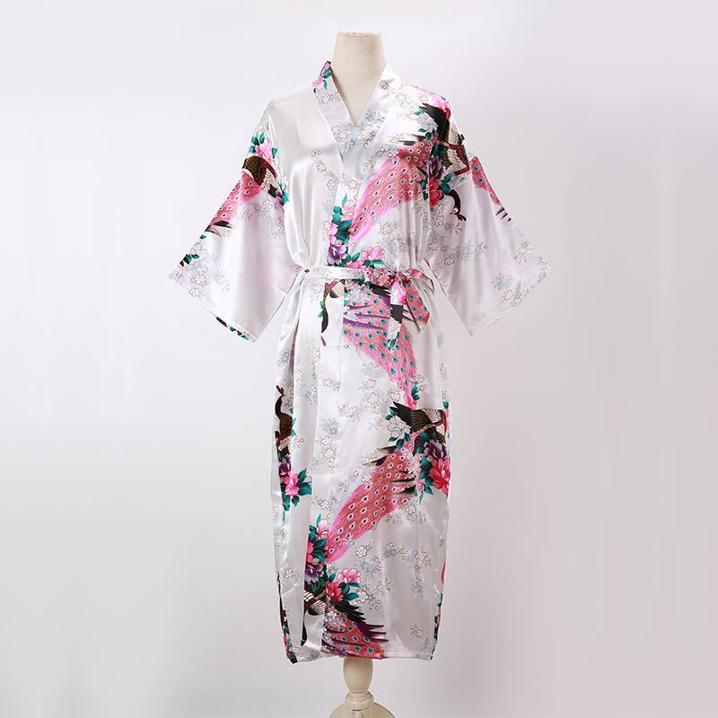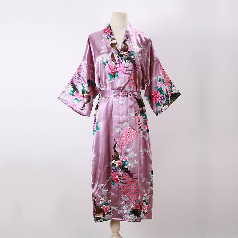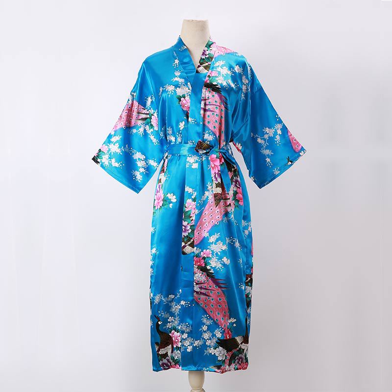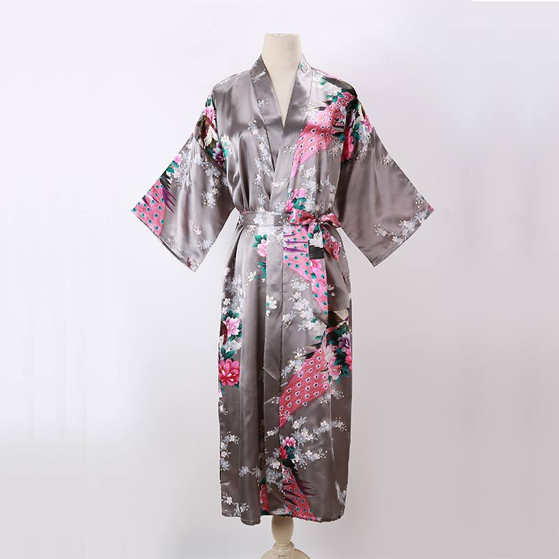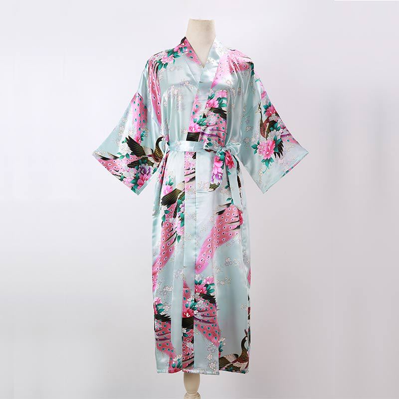 여성 섹시 롱 잠옷 여름 기모노 가운 얇은 공작새 프린트 목욕 가운 모조 실크 기모노 잠옷 대외 무역