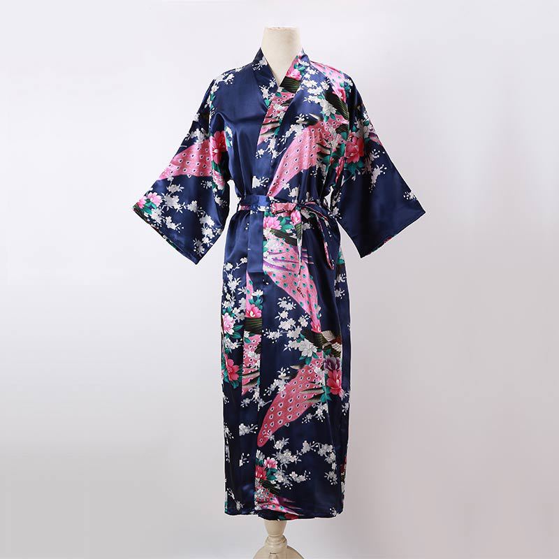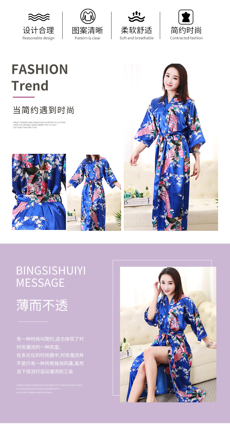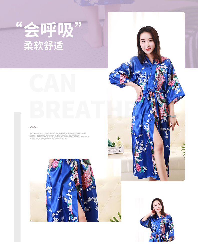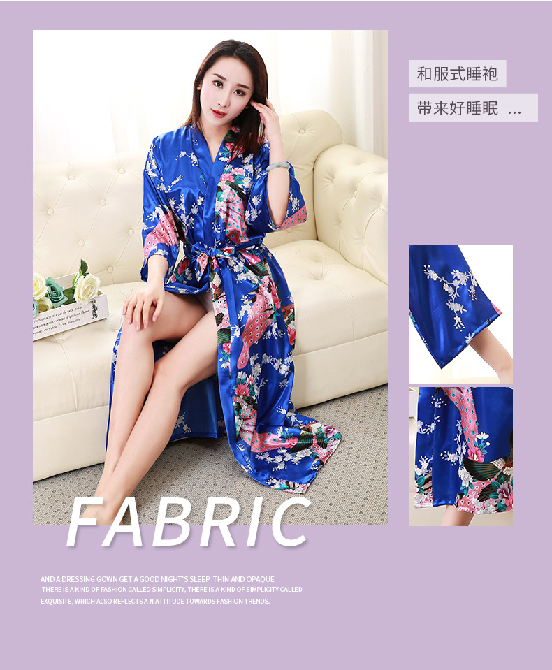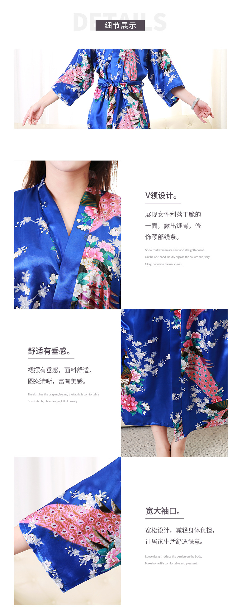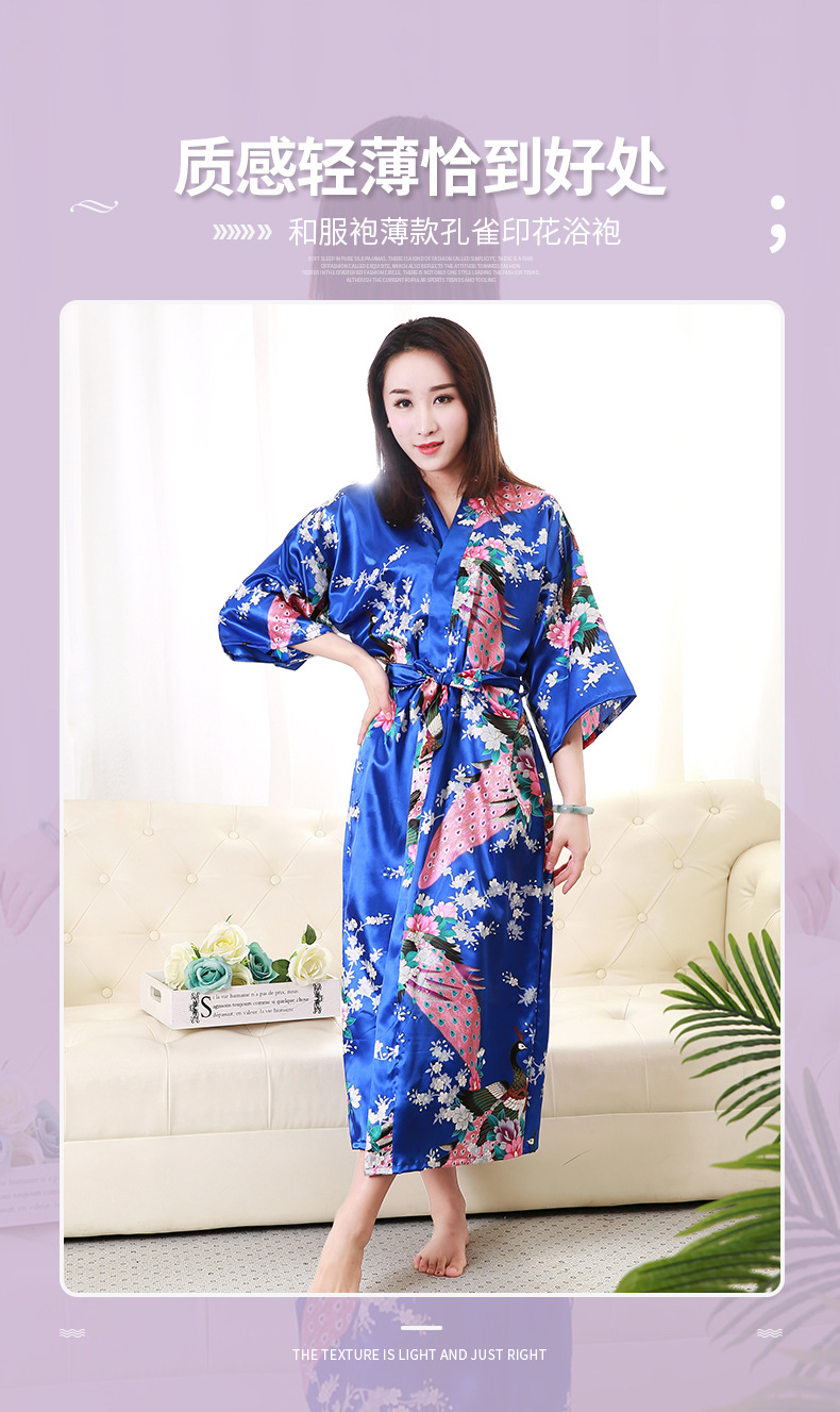 여성 섹시 롱 잠옷 여름 기모노 가운 얇은 공작새 프린트 목욕 가운 모조 실크 기모노 잠옷 대외 무역스토어 가기