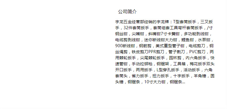宇龙工具厂是钢丝钳、断线钳、管子钳、卷尺、螺丝刀等产品专业生产加工的公司,拥有完整、科学的质量管理体系。宇龙工具厂的诚信、实力和产品质量获得业界的认可。欢迎各界朋友莅临参观、指导和业务洽谈。