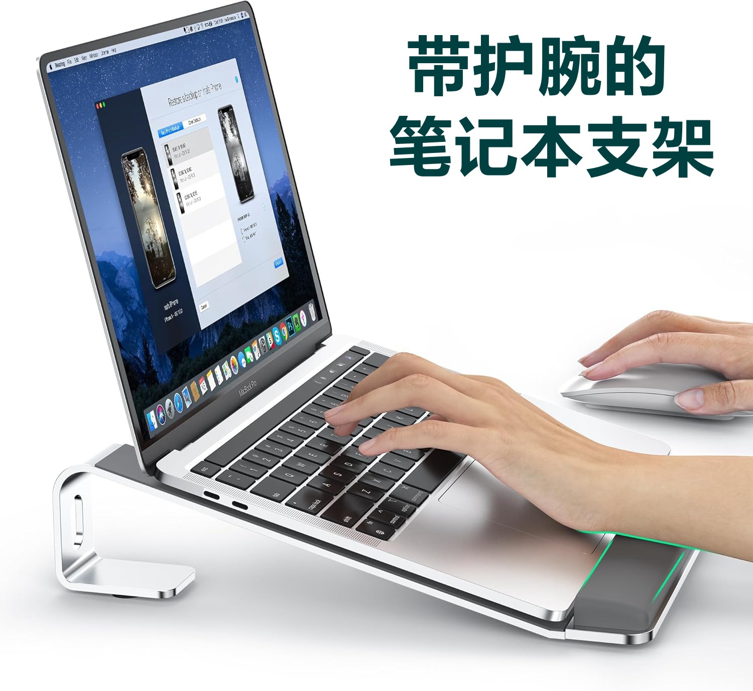 2色可选(银色、玫瑰金)铝合金材质、着色喷沙氧化处理工艺,笔记本通用。可调5档设计,使用更方便。