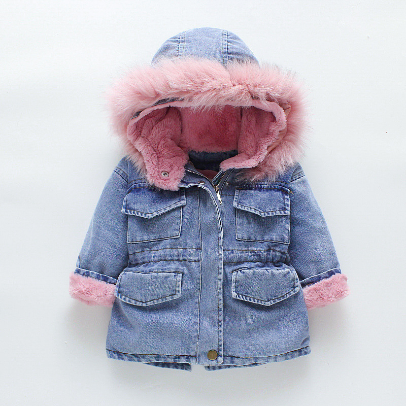여아 기모 두꺼운 허리 데님 코트 코트 어린이 가을과 겨울 후드 울 칼라 따뜻한 데님스토어 가기