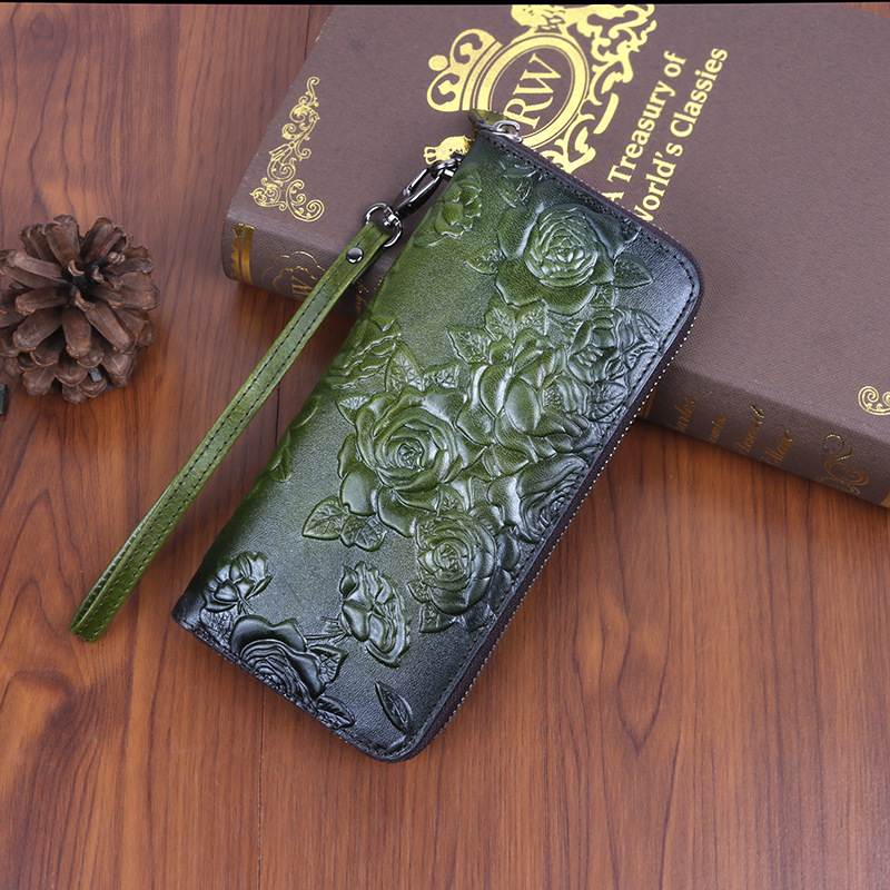 2023년 소가죽 레트로 스타일 롱 여성용 클러치백 다중 카드 슬롯 엠보싱 컬러링 지퍼백 통기성 항균스토어 가기