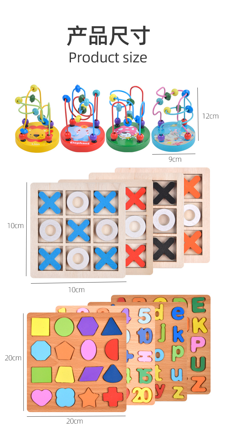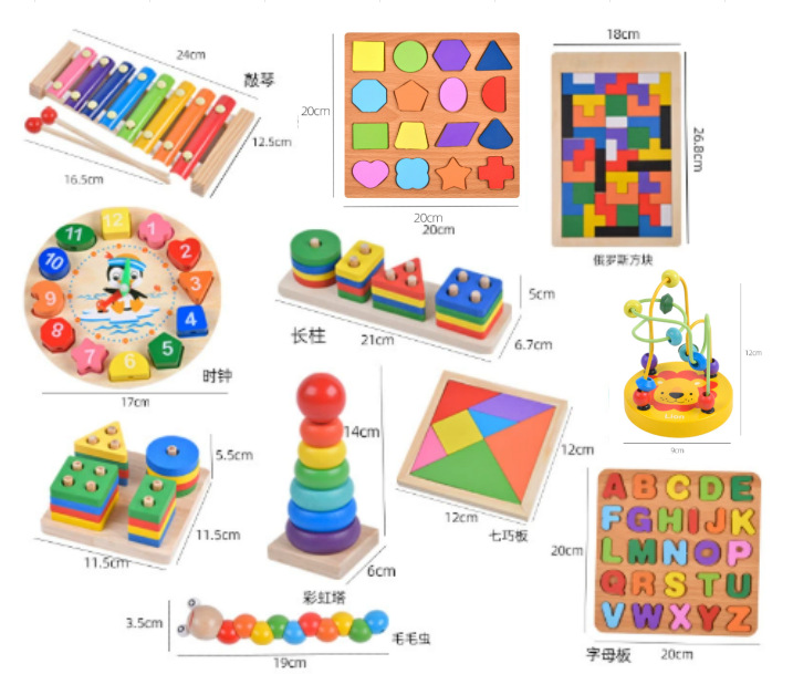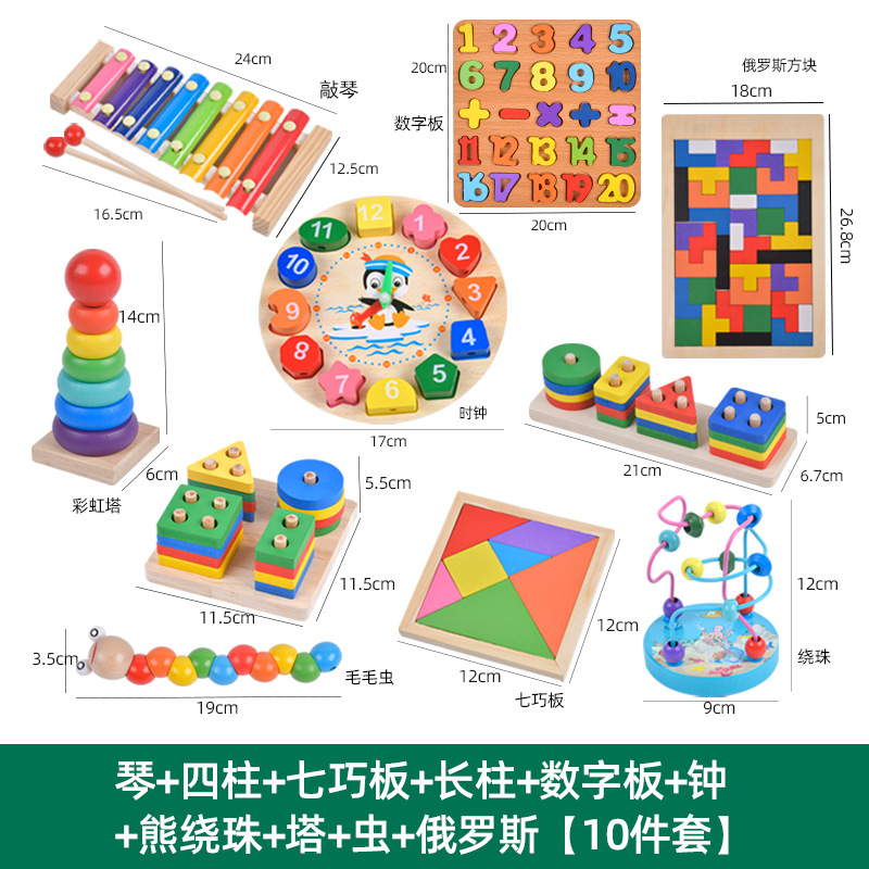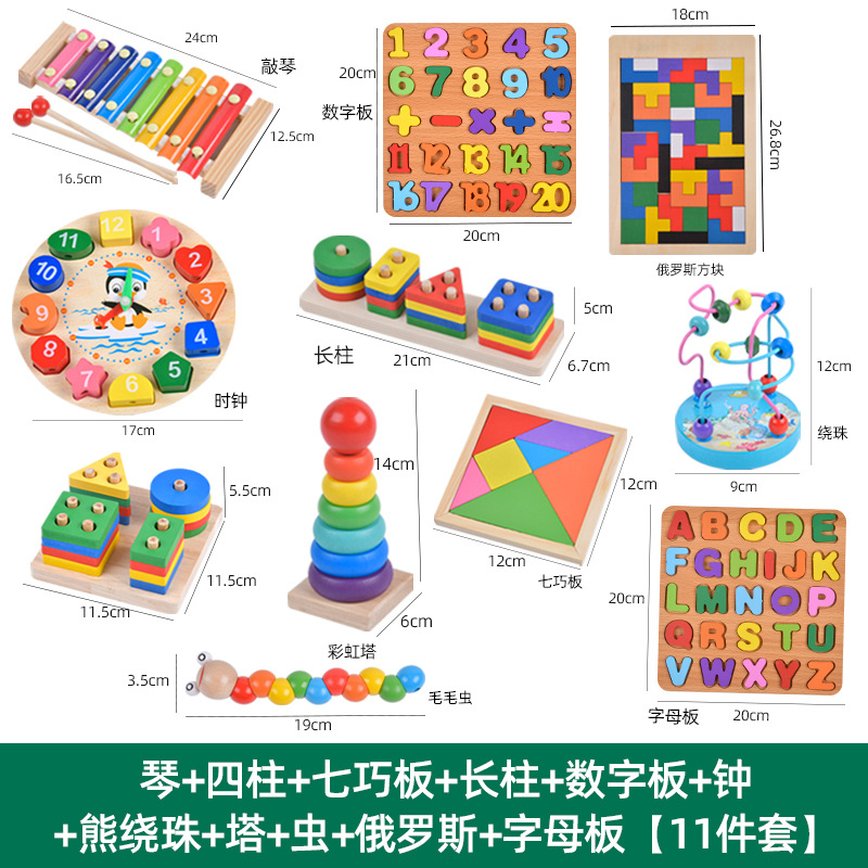 • 피아노 + 기둥 4개 + 칠교놀이 + 긴 기둥 + 모양판 + 시계 + 구불구불한 구슬(사자) + 탑 + 벌레 + 러시아 + 알파벳판 [11종 세트]