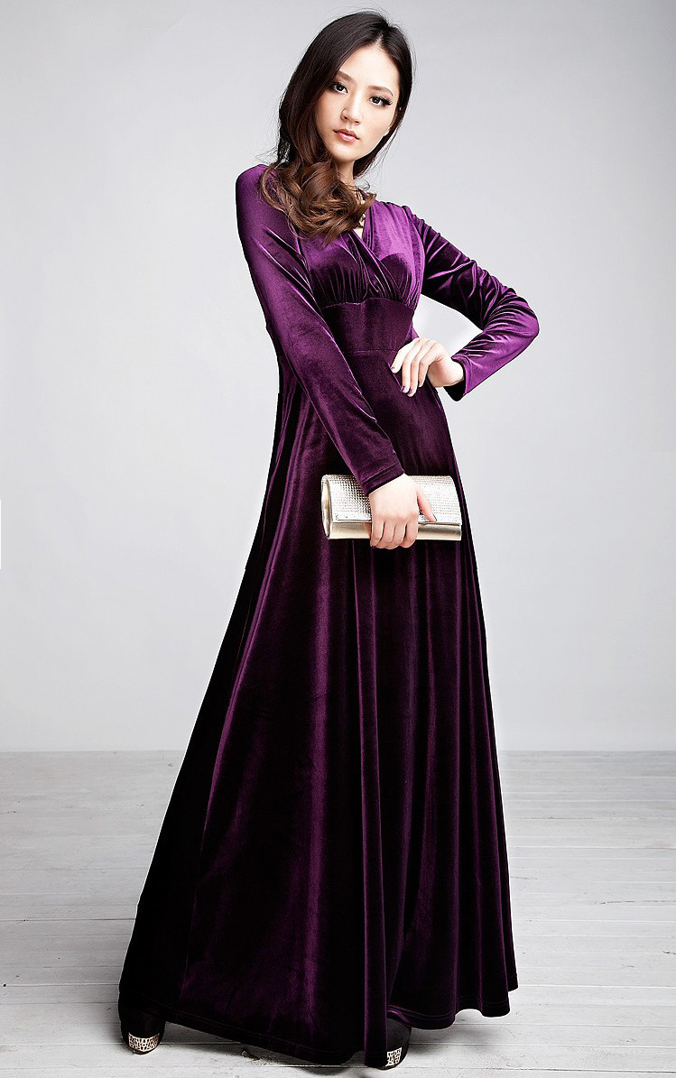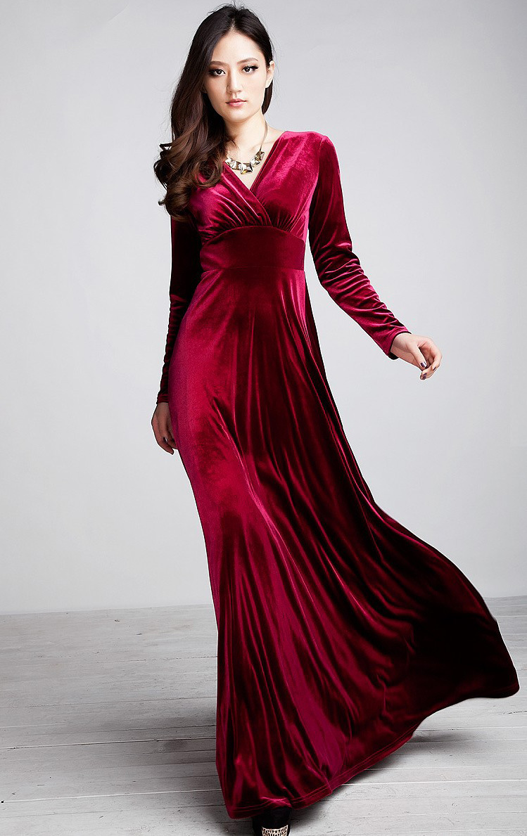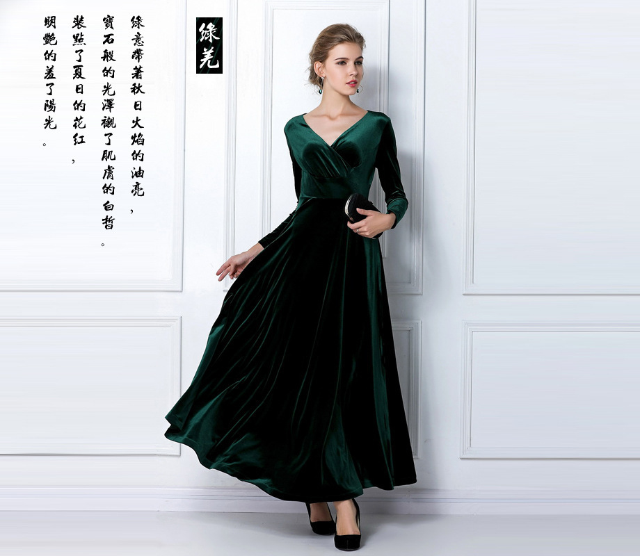 大码女装欧美外贸长袖V领长款大摆拖地金丝绒长裙连衣裙
