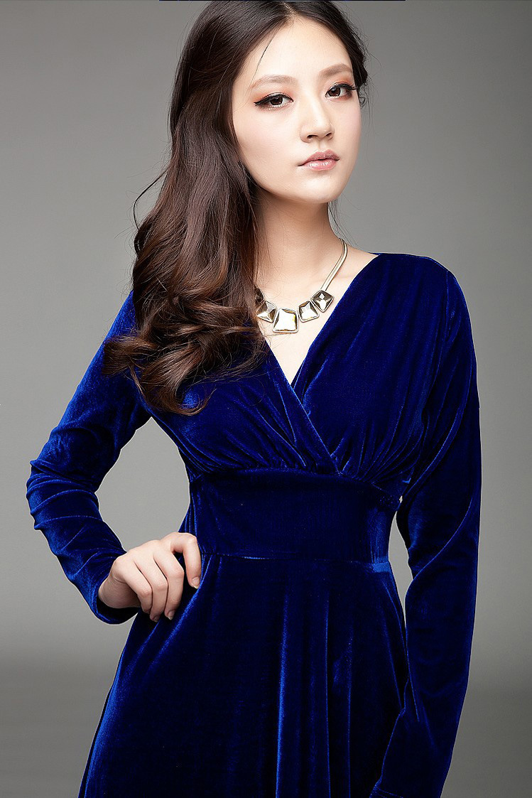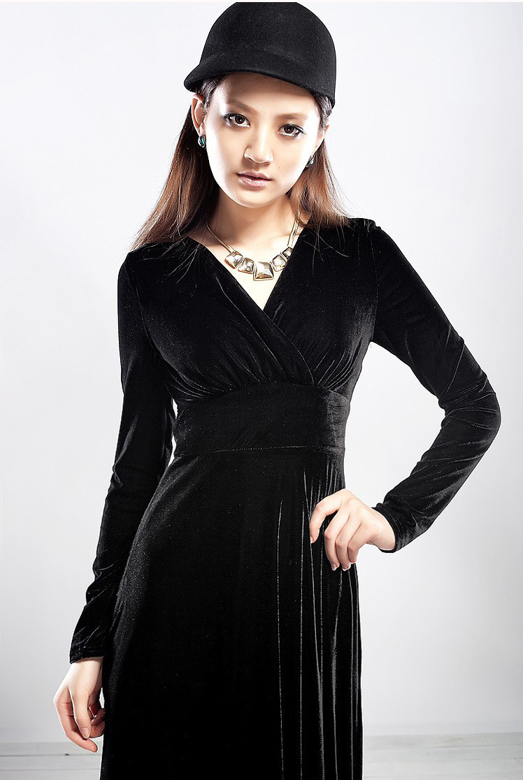 빅사이즈 여성복 유럽 및 미국 수출용 긴팔 브이넥 롱 드레스 긴 밑단 벨벳 드레스