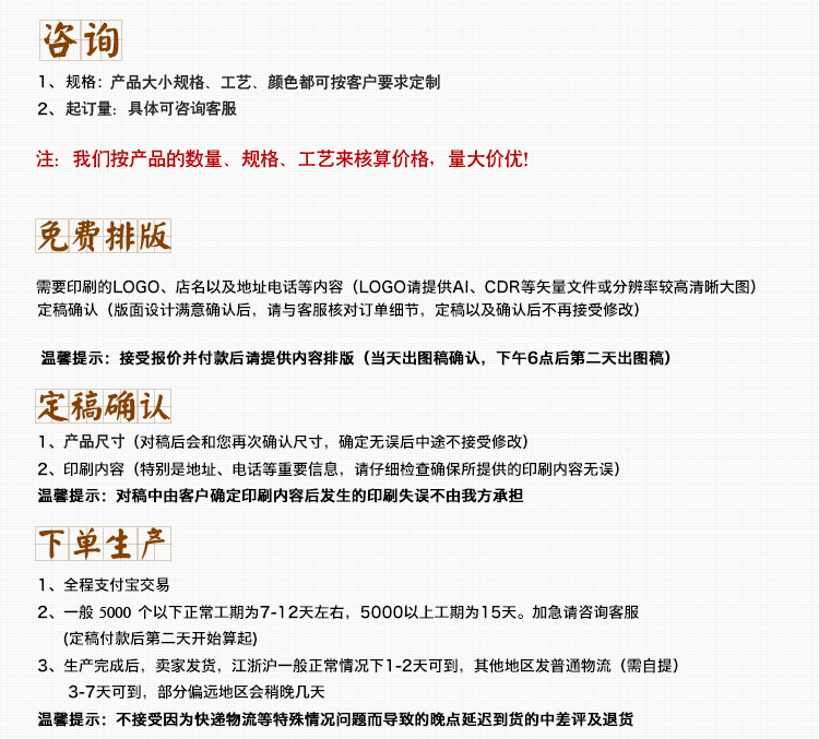 6、售后服务:因长途运输过程当中所产生的货物损坏及因运输过程或人力不可控制因素等所造成的时间拖延,我们不予承担。