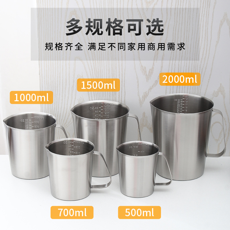 不锈钢材质,坚固耐用好清洁,使用方便既可当测量量杯,又可作拉花杯用,特别是打奶泡时,方便量取牛奶以及显示打好奶泡的容量位置,尖嘴设计,适合多种用途.