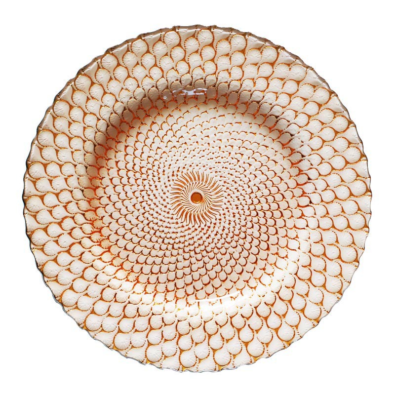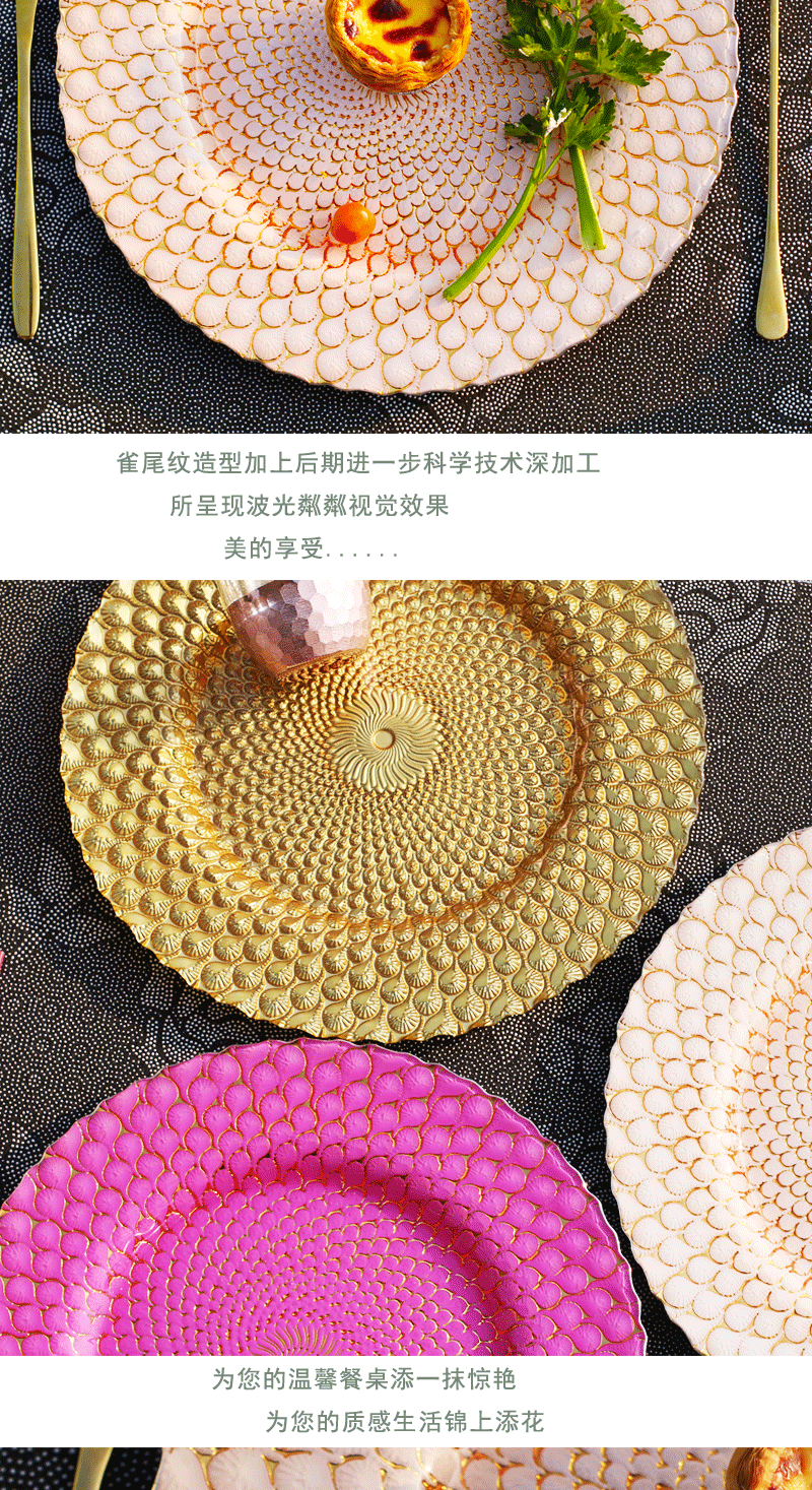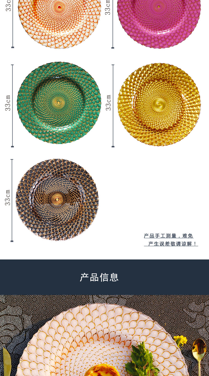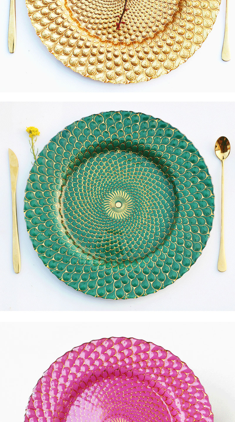 인기 판매 전기 도금 유리 접시 컬러 공작 깃털 웨딩 메인 디너 접시 33cm 서양 과일 플랫 플레이트스토어 가기