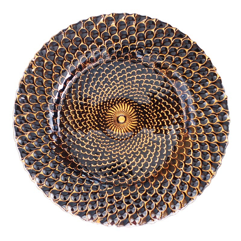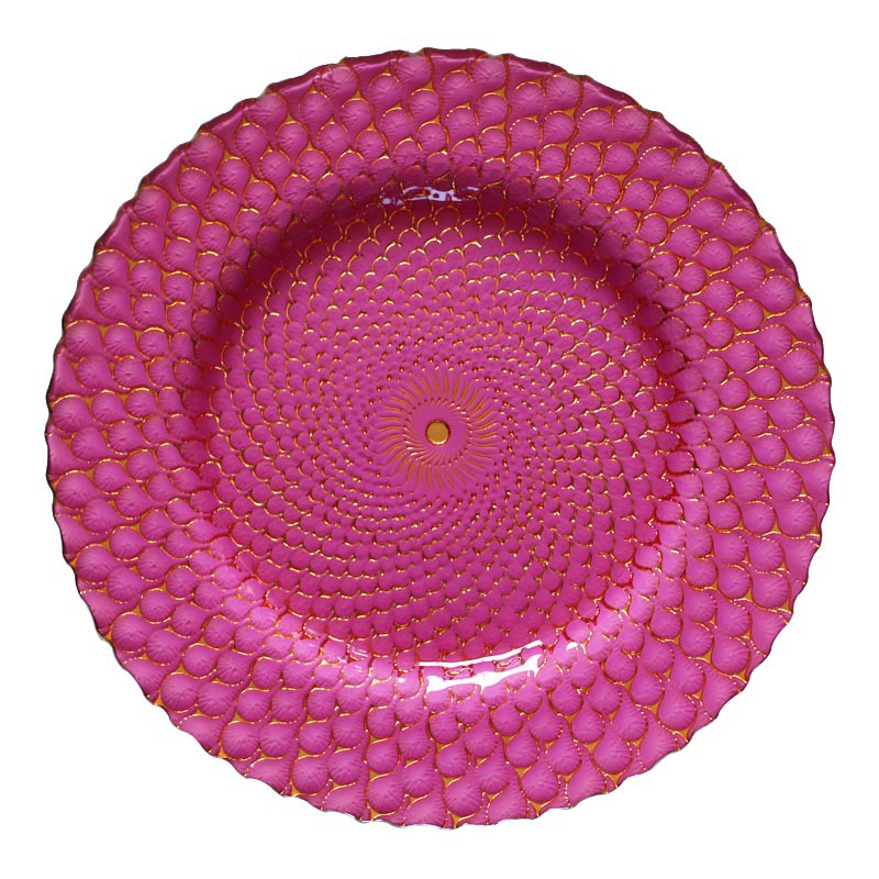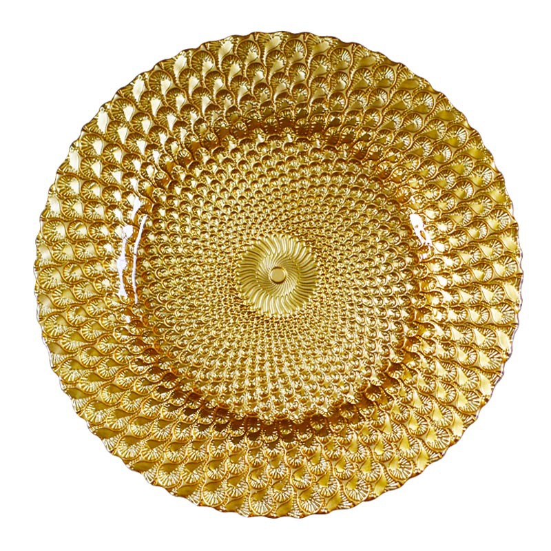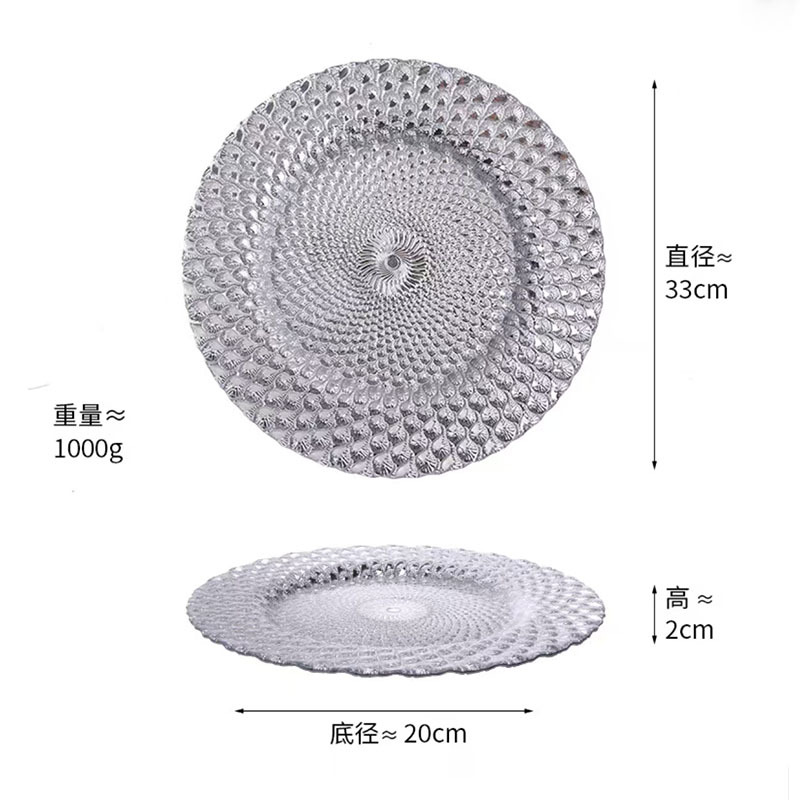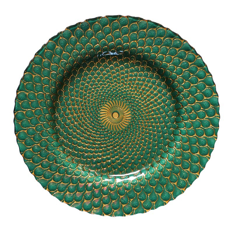 인기 판매 전기 도금 유리 접시 컬러 공작 깃털 웨딩 메인 디너 접시 33cm 서양 과일 플랫 플레이트