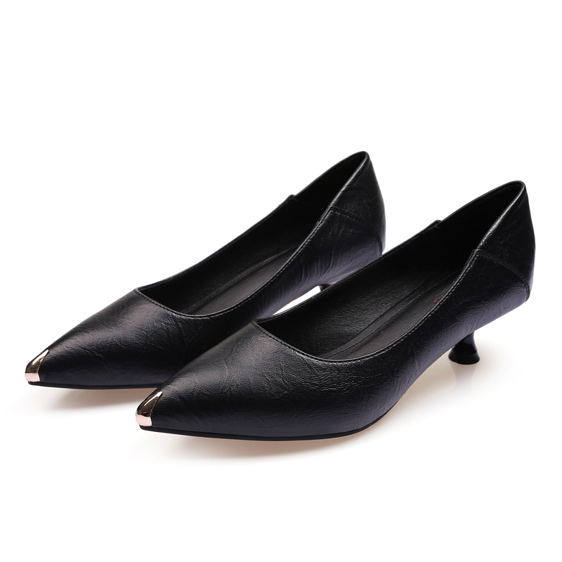 2023 봄 여름 가을 부드러운 가죽 뾰족한 금속 머리 안티 킥 얕은 고양이 힐 스틸레토 힐 여성의 새로운 흑인 직업스토어 가기