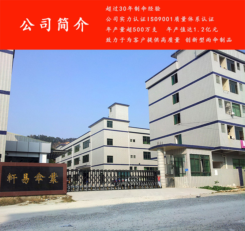深圳市轩易伞业有限公司是一家集设计、生产、销售、研发于一体的全方位制伞企业。公司正式成立于2016年初,属广兴(深圳)福泰洋伞厂(成立于1986年),主要任务为紧跟市场潮流,时刻关注雨伞动态,提升公司线上知名度,提高企业市场敏感度!经过3年多的奔跑,轩易人集中精力搞研发,踏踏实实做市场。轩易伞业已经为总公司提供源源不断的市场信息,不断提高企业和产品的竞争力。
